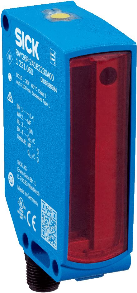 This is Retroreflective Photoelectric Sensor Rectangular Sensor 0 → 1.5 m Detection Range IO-LINK manufactured by Sick. The manufacturer part number is RAY26P-24862130A00. The product also features robust plastic, vistal housing material. The product complies with all safety standards, such as ce, culus listed. It also carries 40 ma maximum current. It is IP rated with ip66, ip67. Whereas, the minimum operating temperature of the product is -40°c. The product ray26, is a highly preferred choice for users. It has provided with male connector electrical connection. The device is designed to detect retroreflective. Furthermore, it has apnp output. It has a typical thread size of m12. Its switching mode is light / dark switching . The product has 0 → 1.5 m of detection range. It is tailored with io-link communication protocol . The sensor has a rectangular design. A bespoke product is io-link v1.1 interface. It responds within 3 ms. It has 30v maximum DC voltage. It has a maximum operating temperature of +60°c. The terminal is a m12 4 pin connector type. Uses pinpoint led as a light source.