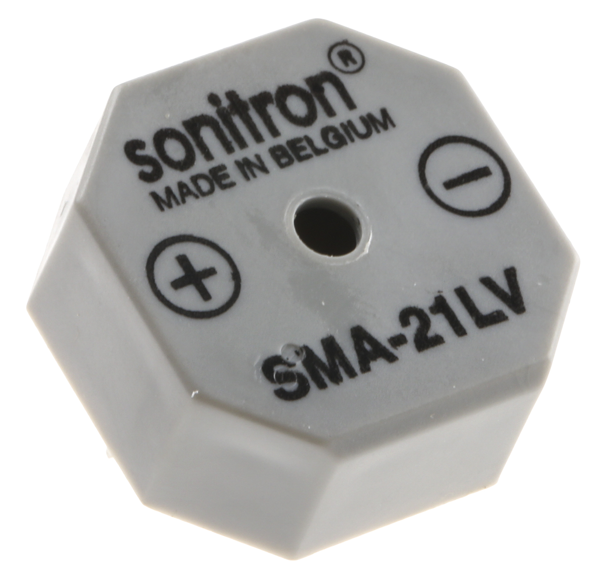 This is 2 → 6 V 87dB Continuous Internal Buzzer Maximum of 3000 Hz manufactured by Sonitron. The manufacturer part number is SMA-21LV-P15. Its diameter is 21mm. The given dimensions of the product include 21 x 21 x 9.5mm. The product is available in surface mount configuration. It has a minimum 2v dc supply voltage . It features 13ma supply current. The product features a internal drive. Its accurate length is 21mm. In addition, the height is 9.5mm. It has a/an continuous type tone . The product comes in 21mm depth. It features 3khz of maximum frequency. Whereas, the minimum operating temperature of the product is -20°c. The product requires a maximum 6v dc supply voltage . Its sound level is about 87db . It has a maximum operating temperature of +70°c.