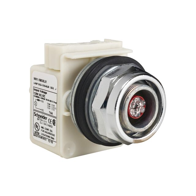 This is Pilot Light 30mm Cutout 120 V manufactured by Schneider Electric. The manufacturer part number is 9001KP38LR. Whereas its cut-out diameter is 30mm. Moreover, the product has a nominal 120 v voltage rating. The product is available in panel mount configuration. The terminal is a screw type. It also has a 1.18" (30.00mm) dimensional features. It comes in led configuration. The product has a nice round shape. It has an attractive and classic red colour. The schneider electric's product offers user-desired applications. It has a long 5 weeks standard lead time. It is IP rated with nema 3r, 1, 2, 3, 4, 6, 12, 13. The product harmony 9001k, is a highly preferred choice for users. In addition, box is the available packaging type of the product. It carries a 120v of voltage.