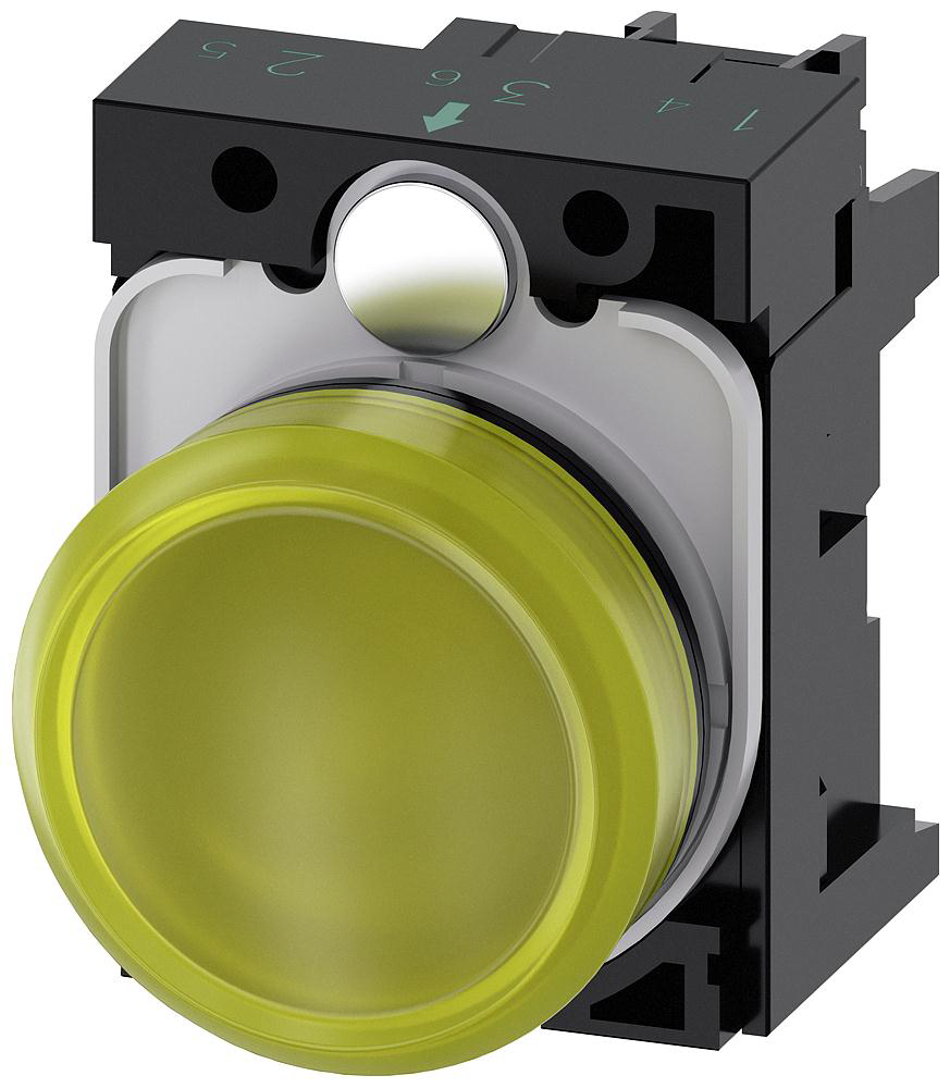 This is SIRIUS ACT Yellow LED Indicator 22mm Cutout IP20 IP66 IP67 IP69 IP69K Round 230 V ac manufactured by Siemens. The manufacturer part number is 3SU1106-6AA30-1AA0. Is it a better world product? yes. The product is available in panel mount configuration. Moreover, the product has a nominal 230v ac voltage rating. Its pilot light is of yellow colour . The product sirius act, is a highly preferred choice for users. It has a pilot light complete unit type pilot type . Its pilot light is made using plastic material . The product's body is nicely designed from plastic materials. Whereas its cut-out diameter is 22mm. It is a type of led lamp. It is designed with an attractive round shape pilot light . The terminal is a screw type.
