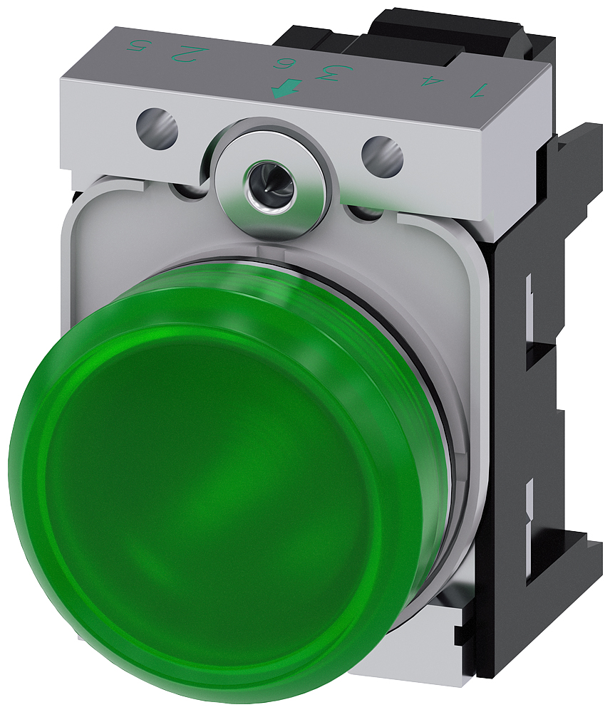 This is SIRIUS ACT front panel mounting Green LED Indicator 22.3mm Cutout IP66 IP67 IP69(IP69K) Round manufactured by Siemens. The manufacturer part number is 3SU1156-6AA40-3AA0. Is it a better world product? yes. The product is available in panel mount configuration. Moreover, the product has a nominal 230v ac voltage rating. Its pilot light is of green colour . The product sirius act, is a highly preferred choice for users. It has a pilot light complete unit type pilot type . Its pilot light is made using plastic material . The product's body is nicely designed from metal materials. Whereas its cut-out diameter is 22mm. It is a type of led lamp. It is designed with an attractive round shape pilot light .
