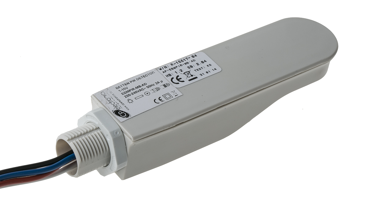 This is Batten Mount PIR Detector Presence Detector PIR Ceiling Mount 230 V ac manufactured by RS Pro. The manufacturer part number is 796-2025. Its sensor's radius is about 16m . This detector is a versatile presence detector. In addition, the height is 28 mm. Furthermore, the product is 33mm wide. The product comes in 144 mm depth.