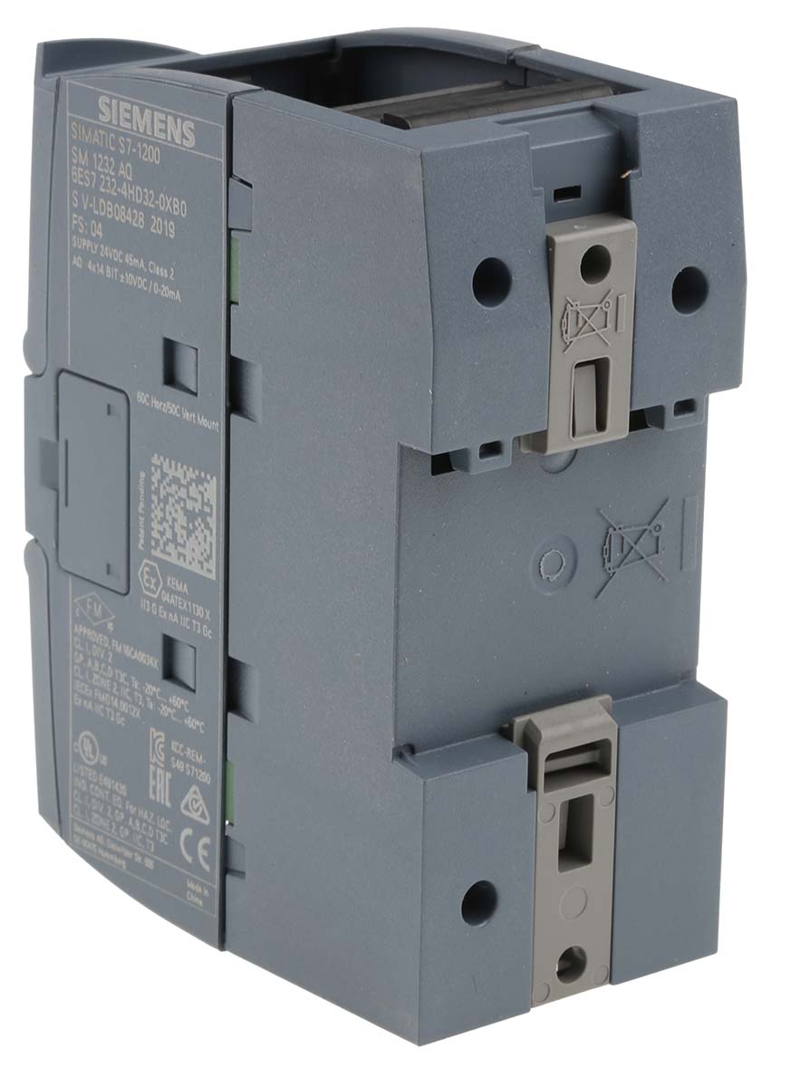 This is SM 1232 PLC I/O Module 4 Outputs 0 → 20 mA 24 V dc 100 x 45 x 75 mm manufactured by Siemens. The manufacturer part number is 6ES7232-4HD32-0XB0. Additionally, the product is supplied with 4 outputs. It carries 0 → 20 ma output current. The product sm 1232, is a highly preferred choice for users. It is a type of plc i/o module accessory. Furthermore, it has aanalogue output. It features simatic range. Features 24 v supply voltage. It carries analogue input type. The product is highly suitable for simatic s7-1200 series. It has a maximum operating temperature of +60°c. Furthermore, the cable has a 100 (shielded)m of length. The given dimensions of the product include 100 x 45 x 75 mm.