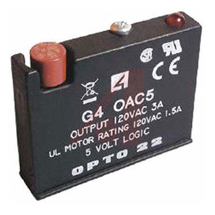 This is G4 PLC I/O Module 3 A 12 → 140 V ac 48.8 x 12.2 x 41.1 mm manufactured by Opto 22. The manufacturer part number is G4OAC5. The given dimensions of the product include 48.8 x 12.2 x 41.1 mm. The product is available in pcb mount configuration. The product snap, is a highly preferred choice for users. It is a type of plc i/o module accessory. Furthermore, it has adigital ac voltage output. Applications Information involves ac relays, heaters, indicators, lamps, motor starters, solenoids. Features 5 v dc supply voltage. It carries digital input type. It has a maximum operating temperature of +70°c. It carries 3 a output current.