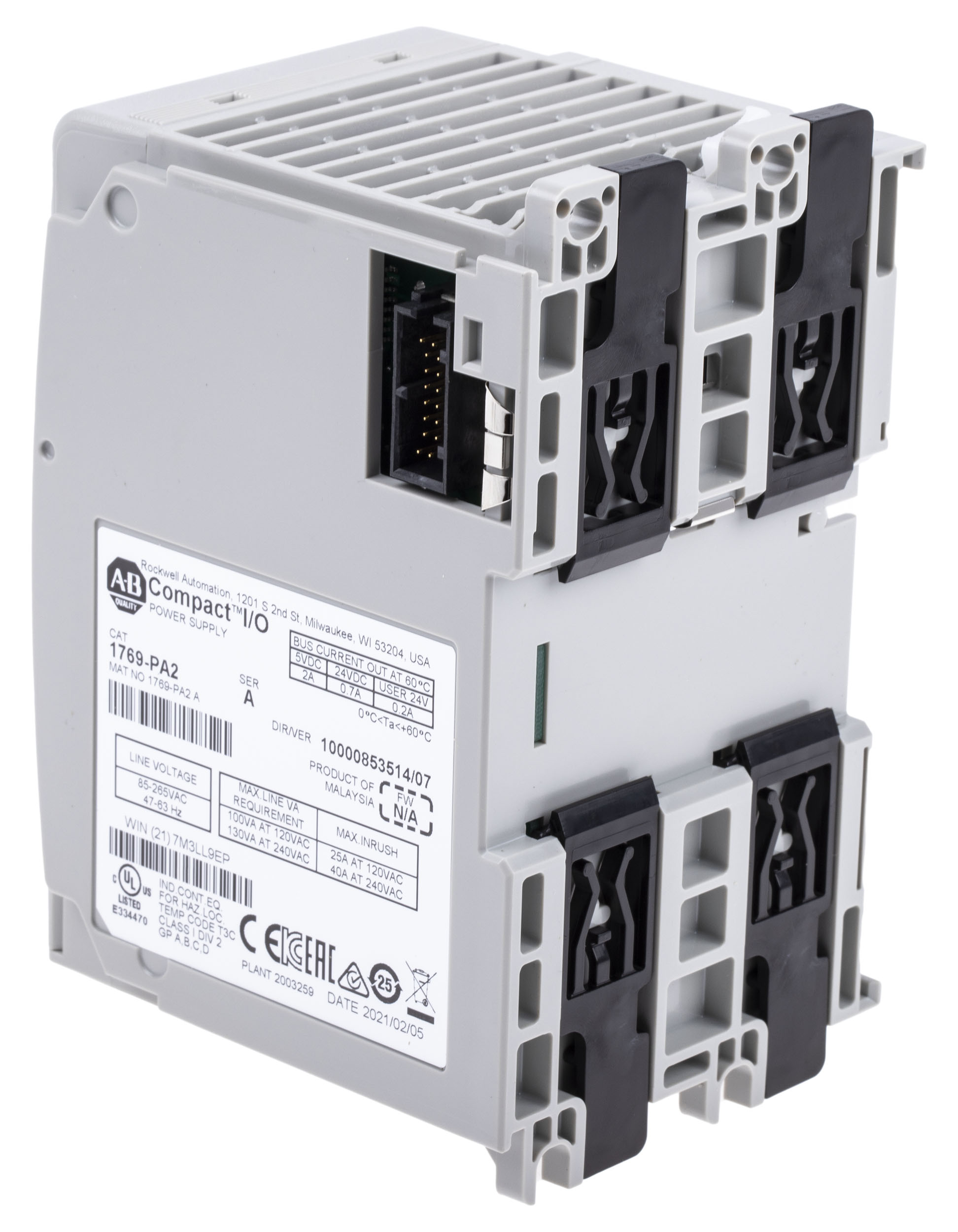 This is PLC Power Supply 1769 Series Compact I/O Module 85 → 265 V ac 5 V dc 24 V dc 2 A manufactured by Allen Bradley. The manufacturer part number is 1769-PA2. The given dimensions of the product include 70 x 118 x 87 mm. It carries 2 a output current. The product 1769, is a highly preferred choice for users. It is a type of plc power supply accessory. Applications Information involves i/o system. It features micrologix range. The product is highly suitable for compact i/o module. It has a maximum operating temperature of +60°c.