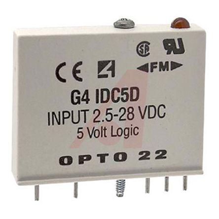 This is G4 PLC I/O Module 50 (Sinking) mA 2.5 → 28 V dc 48.8 x 12.2 x 41.1 mm manufactured by Opto 22. The manufacturer part number is G4IDC5D. The given dimensions of the product include 48.8 x 12.2 x 41.1 mm. The product is available in pcb mount configuration. The product snap b, is a highly preferred choice for users. It is a type of plc i/o module accessory. Furthermore, it has adigital output. Applications Information involves limit switches, photoelectronic switches, proximity switches, push button, selector switches, ttl-compatible devices. Features 5 v dc supply voltage. It carries digital dc voltage input type. It has a maximum operating temperature of +70°c. It carries 50 (sinking) ma output current.
