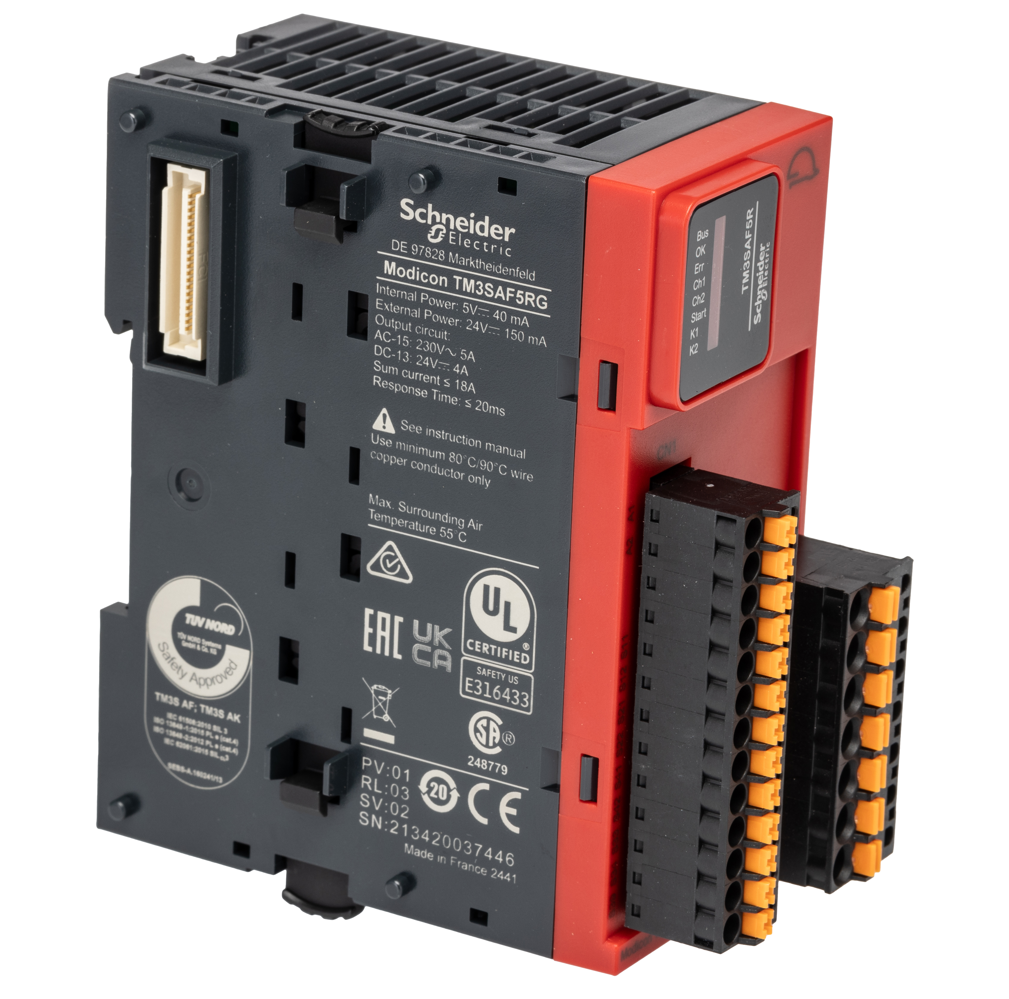 This is Safety Module Safety 24 V dc 42.9 x 84.6 x 90 mm manufactured by Schneider Electric. The manufacturer part number is TM3SAF5RG. Better World Verification Options - green premium. Is it a better world product? yes. It carries 6 a output current. The given dimensions of the product include 42.9 x 84.6 x 90 mm. The product is available in din rail, wall mount configuration. The product modicon tm, is a highly preferred choice for users. It is a type of safety module accessory. Furthermore, it has arelay output. Applications Information involves emergency stop, switch monitoring. It features modicon tm3 safety range. It carries voltage input type. The product is highly suitable for tm2xx plc. The product features spring clamp termination style. It has a maximum operating temperature of +55°c.