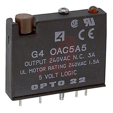 This is G4 PLC I/O Module 3 A 24 → 280 V ac 48.8 x 12.2 x 41.1 mm manufactured by Opto 22. The manufacturer part number is G4OAC5A5. Additionally, the product is supplied with 1 outputs. The given dimensions of the product include 48.8 x 12.2 x 41.1 mm. The product is available in pcb mount configuration. Applications Information involves ac relays, heaters, indicators, lamps, motor starters, solenoids. Whereas, the minimum operating temperature of the product is -30°c. The product has a g4 manufacturer series. It has a/an digital ac output type module . Its accurate length is 48.8mm. Furthermore, it has adigital ac voltage output. Moreover, it has a circuit board connection to host . Furthermore, the product is 12.2mm wide. The product comes in 41.1mm depth. It has about 12ma input current . It carries digital input type. Its voltage is of 24 → 280 v ac category . The product consists of 1 inputs. It has a maximum operating temperature of 70°c. It carries 3 a output current. Features 5 v dc supply voltage.