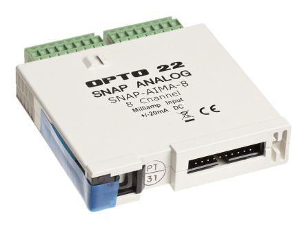 This is SNAP PLC I/O Module 8 x I/O 82.55 x 18.79 x 90 mm manufactured by Opto 22. The manufacturer part number is SNAP-AIMA-8. The given dimensions of the product include 82.55 x 18.79 x 90 mm. The product is available in snap-in configuration. Applications Information involves communication. The product consists of 8 inputs. It has a/an analogue input type module . 8 is the I/O value of the product. Its accurate length is 82.55mm. The product has a snap manufacturer series. Moreover, it has a backplane connection to host . Furthermore, the product is 18.79mm wide. The product comes in 90mm depth. It has about 170ma input current . It carries analogue current input type. The product is highly suitable for snap pac system. The product also provides special features, such as lifetime warranty. It has a maximum operating temperature of +70°c. Whereas, the minimum operating temperature of the product is -20°c. Features 5 v dc supply voltage.
