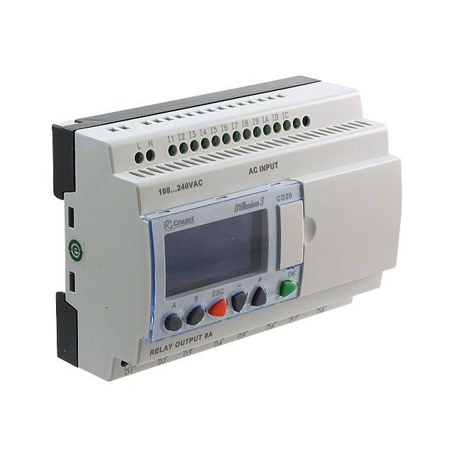 This is Millenium 3 Logic Module 230 V ac 12 x Input 8 x Output With Display manufactured by Crouzet. The manufacturer part number is 88974053. It has about 368 bits program capacity . The given dimensions of the product include 100 x 71.2 x 68 mm. It has a/an serial, usb type communication port . Furthermore, the product is 71.2mm wide. Features 230 v ac supply voltage. It carries digital input type. The product consists of 12 inputs. Furthermore, it has arelay output. It has a maximum operating temperature of +55°c. It uses ladder logic programming language . Additionally, the product is supplied with 8 outputs. Its accurate length is 100mm. The product has a millenium 3 manufacturer series. The product includes 2 communication ports . Additionally, it is designed with a/an front panel programming interface . It carries 8 a output current. The product is available in din rail configuration. The product comes in 68mm depth. Whereas, the minimum operating temperature of the product is -20°c. Display included yes . It is assigned with possible HTSUS value of 8537.10.9170. The product is rohs compliant. Number and outputs type - 8 - relay. The product has -20°c ~ 70°c operating temperature range. It holds a typical memory size of 368 bits/200 words. It is approved by ce, csa, gl, ul. The product is available in chassis mount, din rail configuration. Features 18, 18, 18, 18 characters per row. In addition, it is reach unaffected. It is shipped in bulk package . Its typical moisture sensitivity level is 1 (unlimited). It has a long 3 weeks standard lead time. Typical software is m3 soft. It features a remarkable lcd - white characters, backlight display. It is IP rated with ip40. The splendid features of the product include battery backup (lithium). Inputs and Type of Inputs - 12 - digital. The product millenium 3, cd20, is a highly preferred choice for users. It has optimum voltage supply of 100 ~ 240vac. Expandable Options - non-expandable. The product is designated with the ear99 code number.