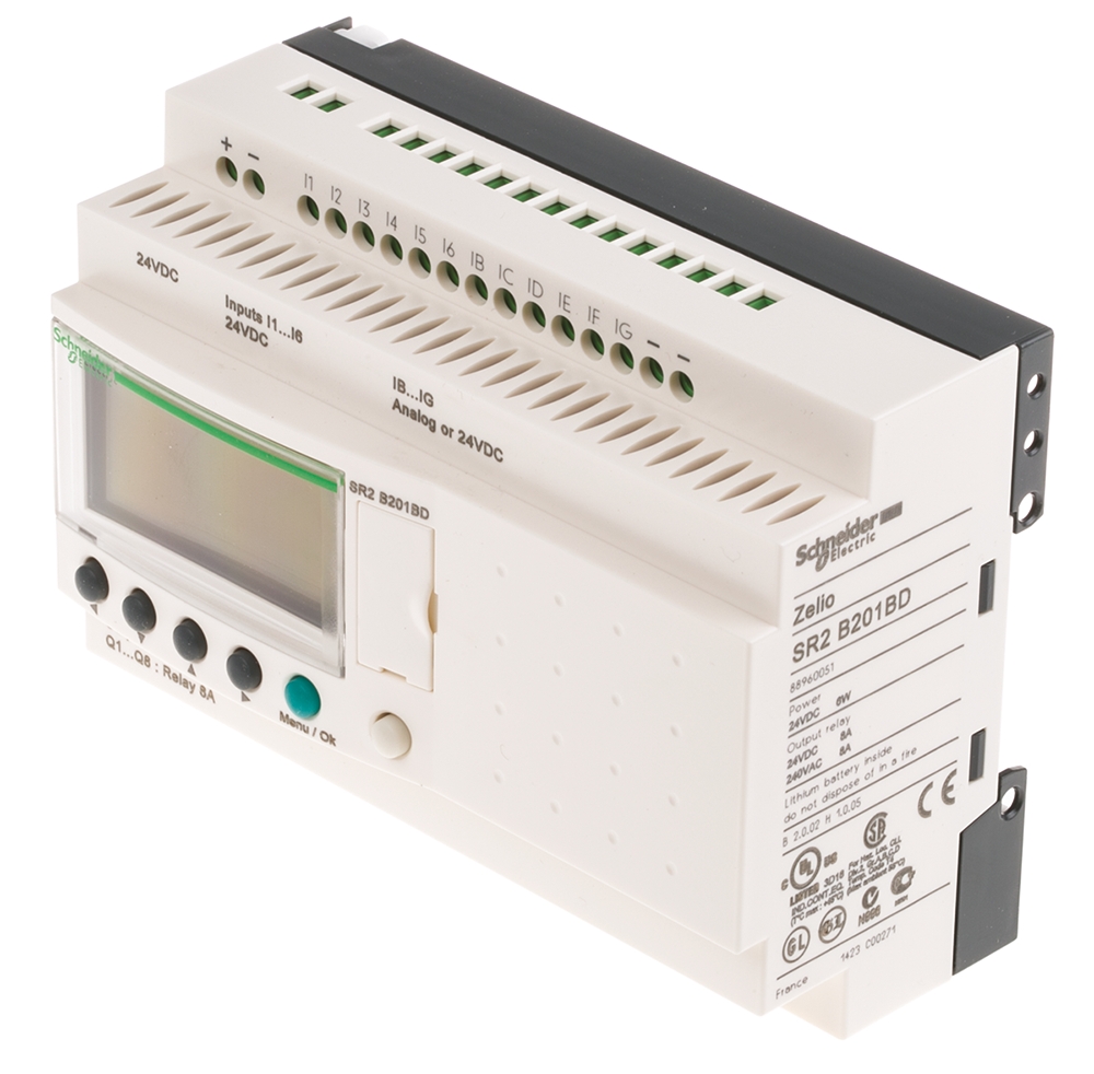This is Zelio Logic 2 PLC CPU Computer Interface 12 (Up → 12 Digital Up → 6 Analogue) Inputs manufactured by Schneider Electric. The manufacturer part number is SR2PACK2BD. Additionally, the product is supplied with 8 (relay) outputs. Better World Verification Options - green premium. Is it a better world product? yes. The given dimensions of the product include 90 x 71.2 x 59 mm. The product is available in din rail configuration. Kit included yes . Its accurate length is 90mm. Furthermore, it has arelay output. The product has a zelio logic 2 manufacturer series. Furthermore, the product is 71.2mm wide. The product comes in 59mm depth. Its voltage is of 24 v dc category . It carries analogue, digital input type. The product is highly suitable for zelio 2. It uses ladder/fbd programming language . Additionally, it is designed with a/an computer programming interface . Display included yes . The product consists of 12 (up → 12 digital, up → 6 analogue) inputs.