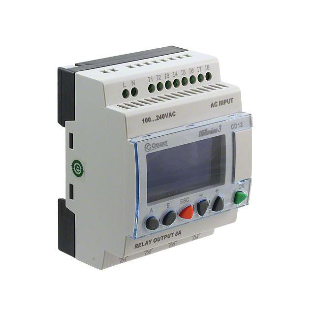 This is MILLENIUM 3 SMART CD12 - 8I/4O R 230VAC manufactured by Crouzet. The manufacturer part number is 88974043. It has about 368 bits program capacity . The given dimensions of the product include 100 x 71.2 x 68 mm. It has a/an serial, usb type communication port . Furthermore, the product is 71.2mm wide. Features 230 v ac supply voltage. It carries digital input type. The product consists of 8 inputs. Furthermore, it has arelay output. It has a maximum operating temperature of +55°c. It uses ladder logic programming language . Additionally, the product is supplied with 4 outputs. Its accurate length is 100mm. The product has a millenium 3 manufacturer series. The product includes 2 communication ports . Additionally, it is designed with a/an front panel programming interface . It carries 8 a output current. The product is available in din rail configuration. The product comes in 68mm depth. Whereas, the minimum operating temperature of the product is -20°c. Display included yes . It is assigned with possible HTSUS value of 8537.10.9170. The product is rohs compliant. Number and outputs type - 4 - relay. The product has -20°c ~ 70°c operating temperature range. It holds a typical memory size of 368 bits/200 words. It is approved by ce, csa, gl, ul. The product is available in chassis mount, din rail configuration. Features 18, 18, 18, 18 characters per row. In addition, it is reach unaffected. The crouzet's product offers user-desired applications. Its typical moisture sensitivity level is 1 (unlimited). It has a long 3 weeks standard lead time. Typical software is m3 soft. It features a remarkable lcd - white characters, backlight display. It is IP rated with ip40. The splendid features of the product include battery backup (lithium). Inputs and Type of Inputs - 8 - digital. The product millenium 3, cd12, is a highly preferred choice for users. In addition, bulk is the available packaging type of the product. It has optimum voltage supply of 100 ~ 240vac. Expandable Options - non-expandable. The product is designated with the ear99 code number.