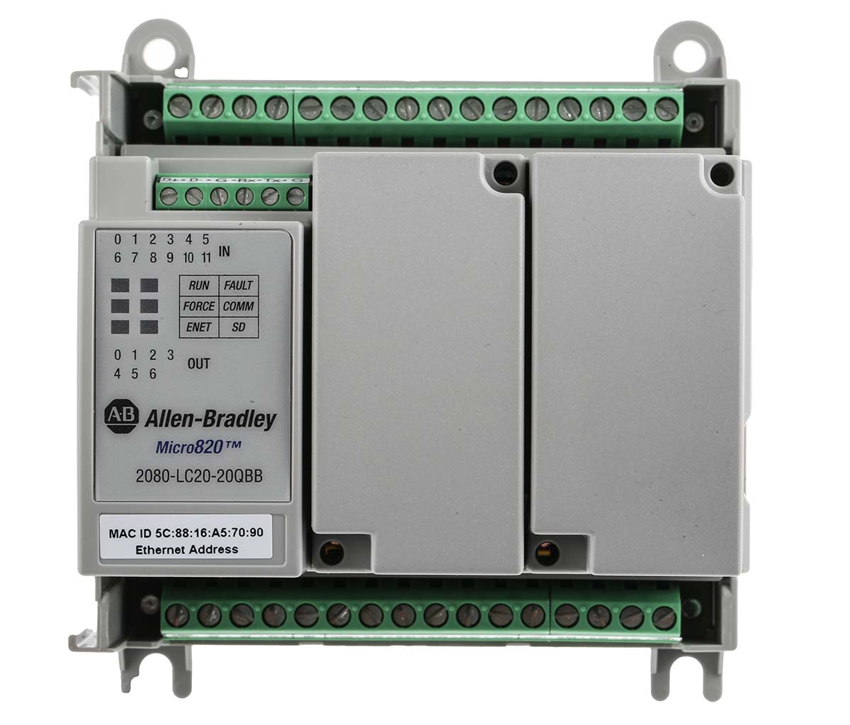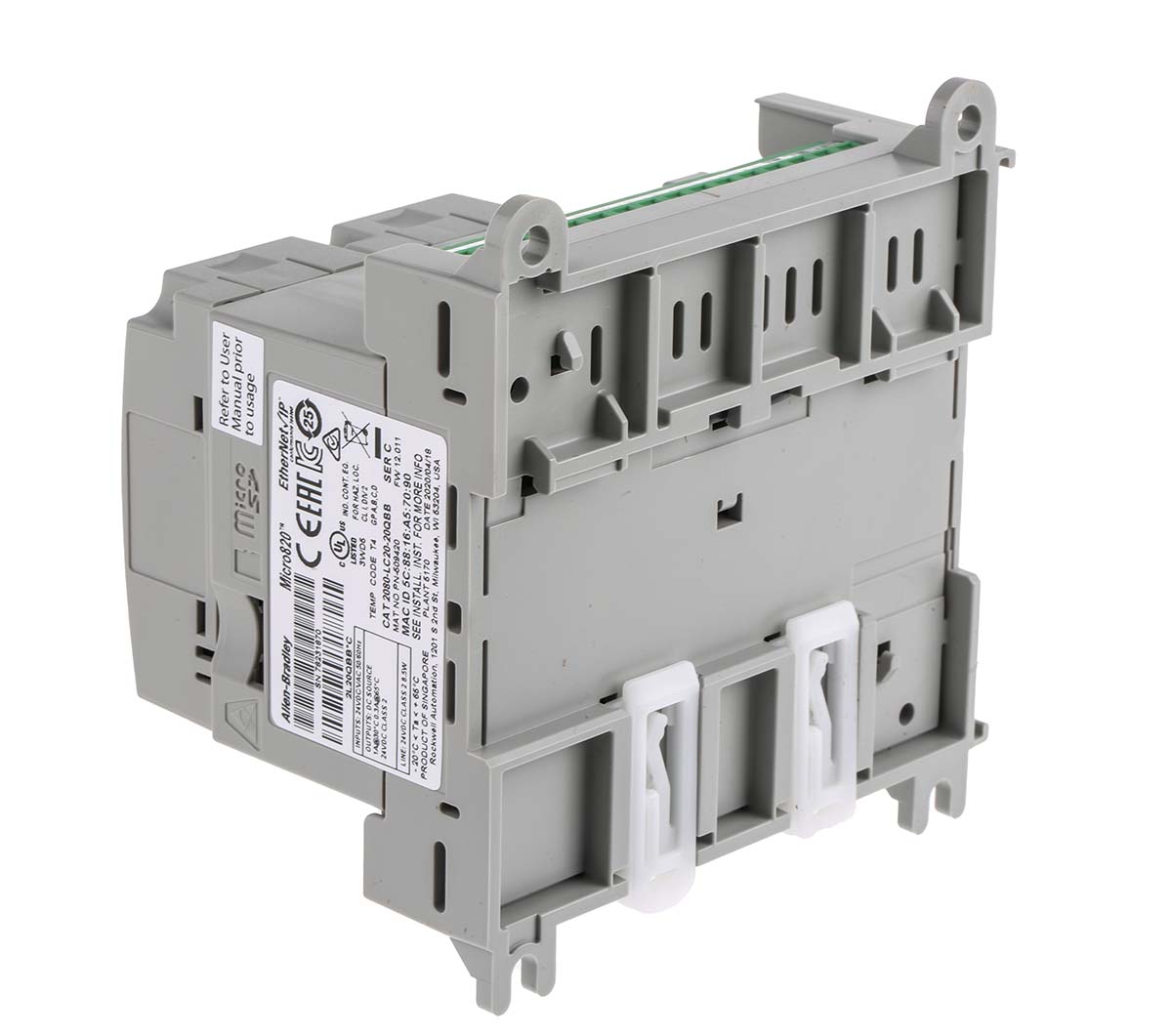Micro820 - Micro PLC The Micro820 20pt Micro PLC is specifically designed for small standalone machines and remote automation projects with embedded Ethernet and Serial ports. It can function as a RTU (remote terminal unit) for remote machines with support for Modbus RTU and TCP. It has embedded support for 4 thermistor temperature inputs for use as a DDC (direct digital controller) for Building Management Systems. Micro PLC with 20 Input/Output Analog and digital I/O Ethernet port RS232/485 interface microSD card slot for program transfer, datalog and recipe Built-in Real Time Clock (RTC) Supports up to two plug-in modules Optional Remote LCD Display available, stock no. 893-7773 24Vdc power supply Allen-Bradley Micro800 PLC Family