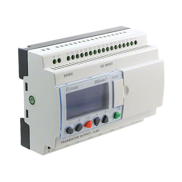 This is Millenium 3 Logic Module 24 V dc 16 x Input 10 x Output With Display manufactured by Crouzet. The manufacturer part number is 88974162. It has about 368 bits program capacity . The given dimensions of the product include 100 x 71.2 x 68 mm. It has a/an serial, usb type communication port . Furthermore, the product is 71.2mm wide. Features 24 v dc supply voltage. It carries digital input type. The product consists of 16 inputs. Furthermore, it has asolid state output. It has a maximum operating temperature of +55°c. It uses ladder logic programming language . Additionally, the product is supplied with 10 outputs. Its accurate length is 100mm. The product has a millenium 3 manufacturer series. The product includes 2 communication ports . Additionally, it is designed with a/an front panel programming interface . It carries 12 a output current. The product is available in din rail configuration. The product comes in 68mm depth. Whereas, the minimum operating temperature of the product is -20°c. Display included yes . It is assigned with possible HTSUS value of 8537.10.9170. The product is rohs compliant. Number and outputs type - 10 - pwm (4), solid state (6). The product has -20°c ~ 70°c operating temperature range. It holds a typical memory size of 368 bits/200 words. It is approved by ce, csa, gl, ul. The product is available in chassis mount, din rail configuration. Features 18, 18, 18, 18 characters per row. In addition, it is reach unaffected. It is shipped in bulk package . Its typical moisture sensitivity level is 1 (unlimited). It has a long 3 weeks standard lead time. Typical software is m3 soft. It features a remarkable lcd - white characters, backlight display. It is IP rated with ip40. The splendid features of the product include battery backup (lithium). Inputs and Type of Inputs - 16 - digital (10), analog/digital (6). The product millenium 3, xd26, is a highly preferred choice for users. It has optimum voltage supply of 24vdc. Expandable Options - expandable. The product is designated with the ear99 code number.
