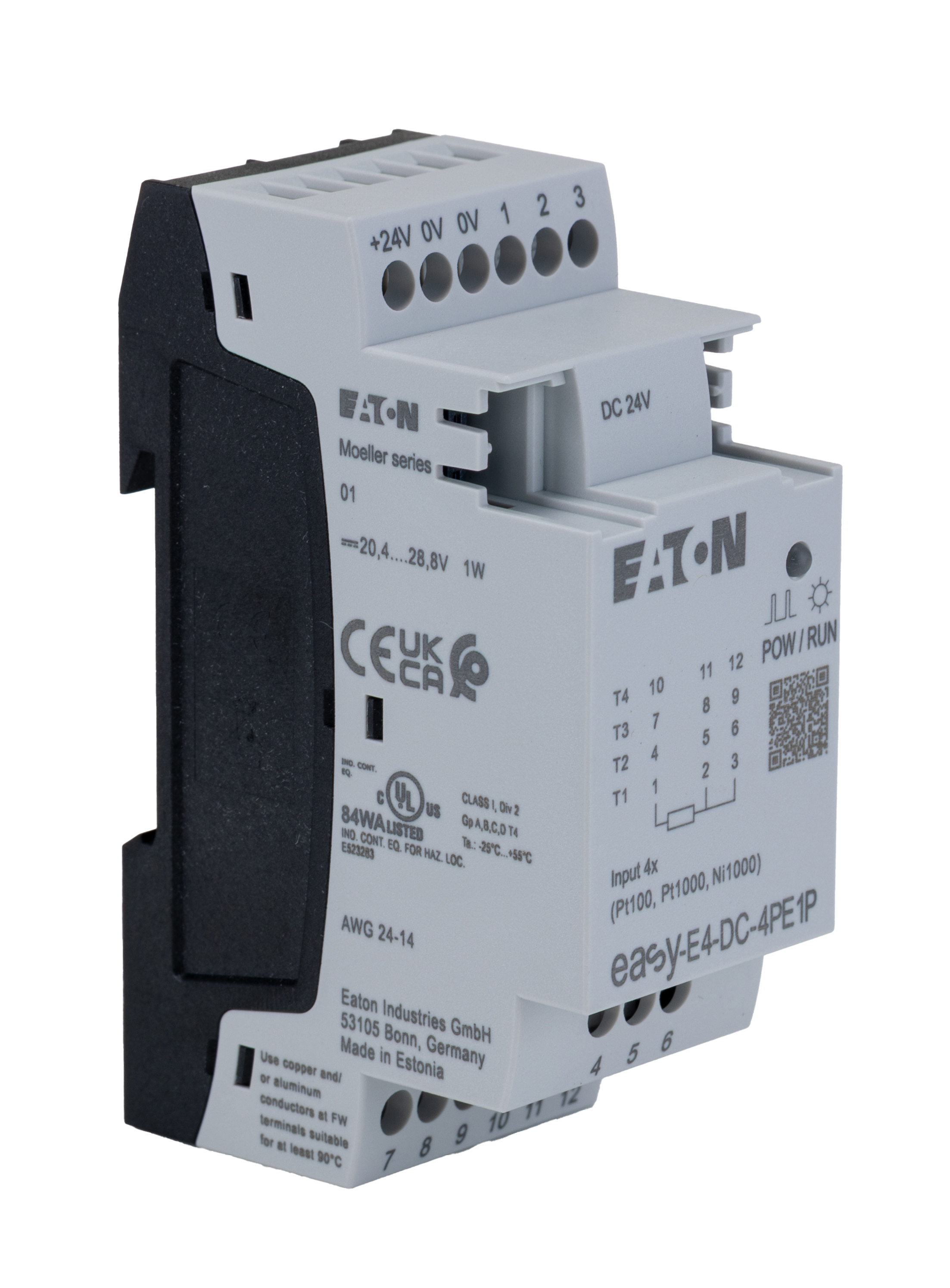 This is Easy Control Relay - 4 Inputs Relay For Use With Easy E4 Ethernet Networking manufactured by Eaton. The manufacturer part number is 197517 EASY-E4-DC-4PE1P. The given dimensions of the product include 58 x 90 x 36 mm. Its voltage is of 24 v dc category . Furthermore, the product is 36mm wide. Features 0 v supply voltage. It carries analog input type. It is designed with a typical ethernet type network . The product consists of 4 inputs. The product complies with all safety standards, such as ce. Furthermore, it has arelay output. The product is created with 0 analogue outputs . It has a maximum operating temperature of +55°c. Additionally, the product is supplied with 0 outputs. It has 0 digital outputs . It contains 0 digital inputs . Its accurate length is 90mm. The product has a easye4 manufacturer series. The product is available in din rail configuration. The product comes in 58mm depth. It has 4 analogue inputs . Whereas, the minimum operating temperature of the product is -25°c. Display included no .