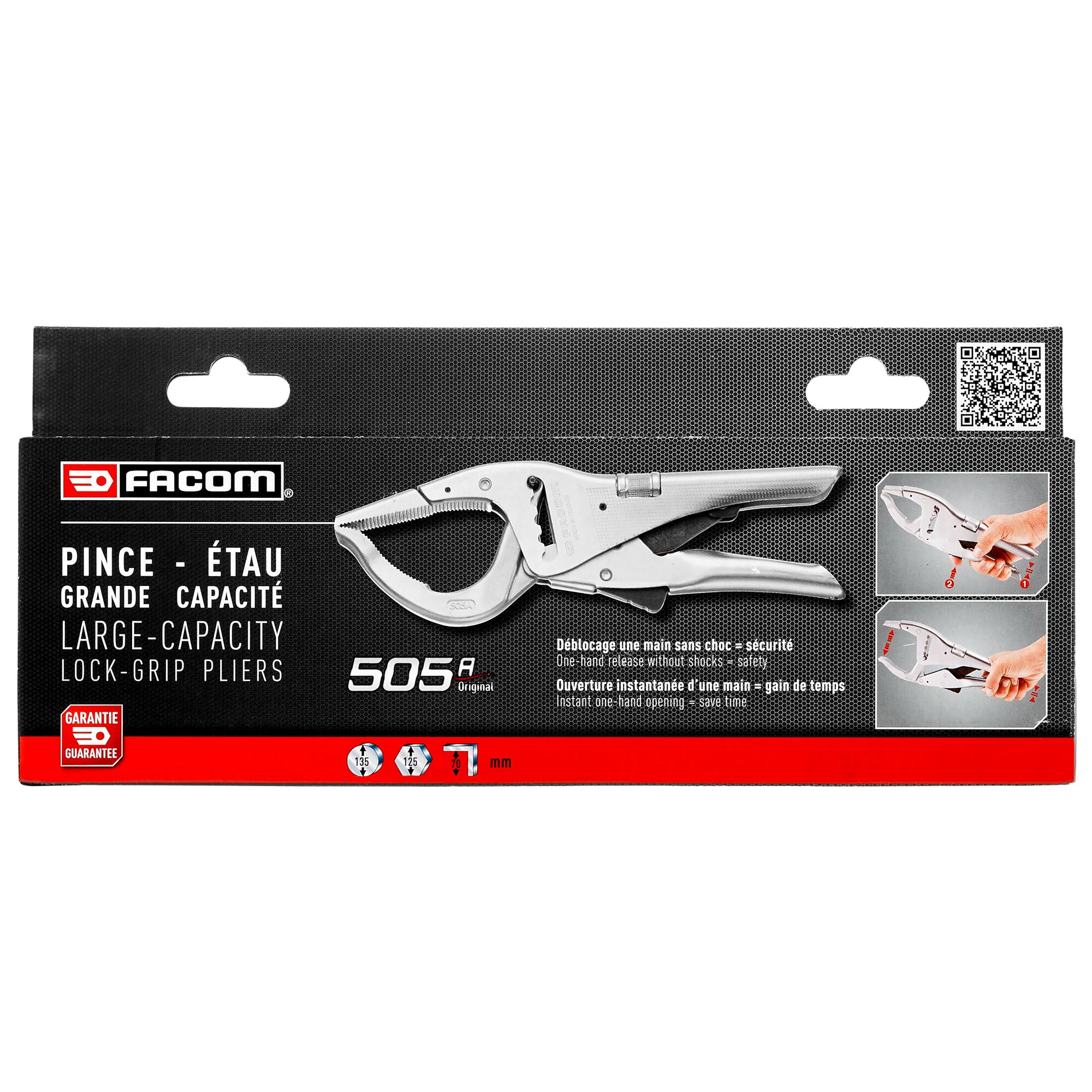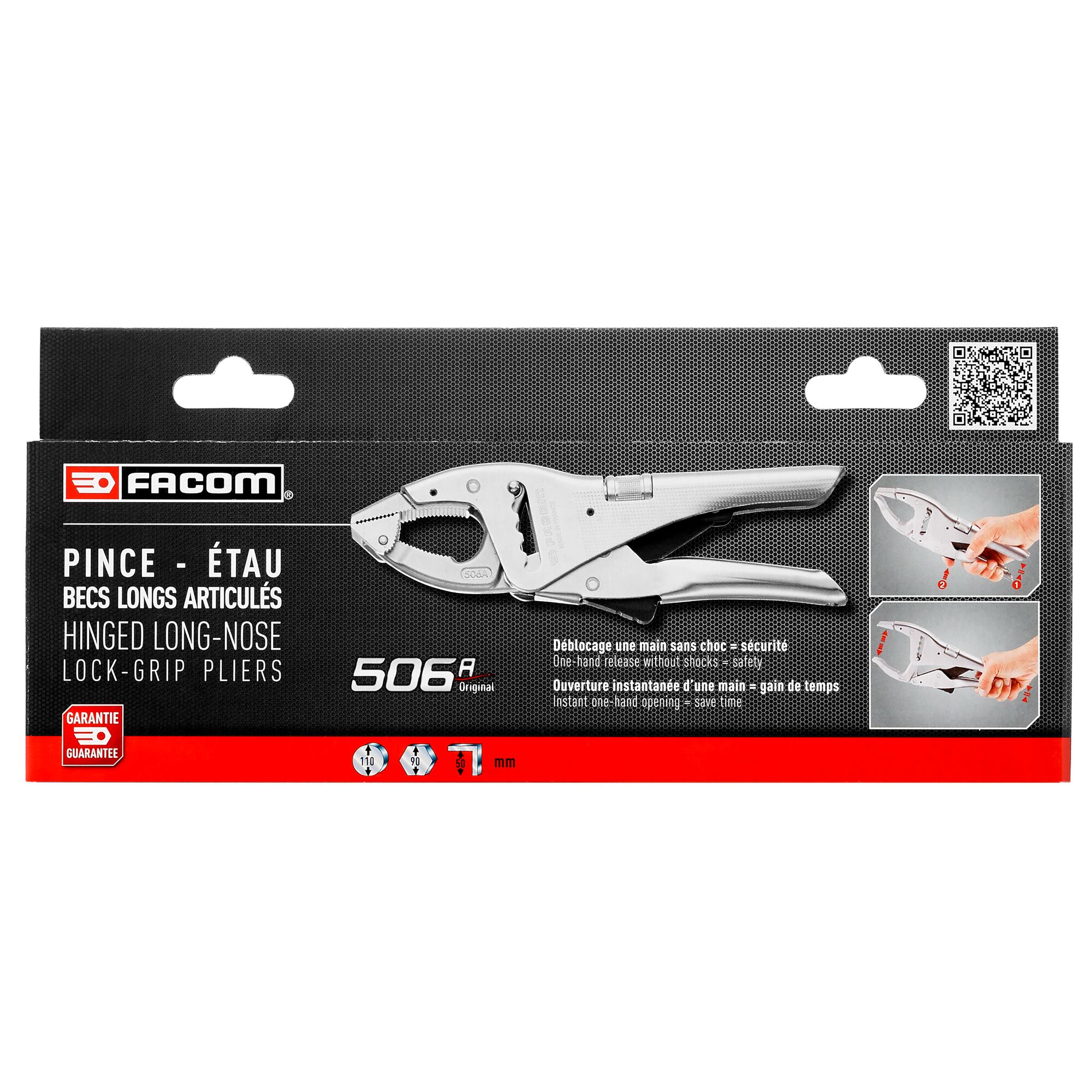 This is 270 mm Chrome Molybdenum Steel Mole Grips with 125 (Hexagonal) mm 135 (Round) mm 70 (Square) mm jaw capacity manufactured by Facom. The manufacturer part number is 505APB. It jaw is about 17mm in length . The product has an integral lock grip tip. The product is made from highly stable and reliable chrome molybdenum steel. It has a model number 505apb. VDE/1000V Approval Options - no. Moreover, it has a plier of locking pliers type . It has an overall length of 270 mm. In addition, Its jaw is 135mm in depth . The product consists of 1 pieces.