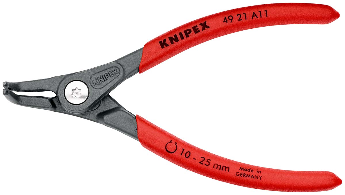 This is 130 mm Chrome Vanadium Steel Circlip Pliers with Bent Tip External Range 10 → 25 mm manufactured by Knipex. The manufacturer part number is 49 21 A11. VDE/1000V Approval Options - no. The product has an integral angled tip. It has a non sparking nature no . It has about 10 → 25 mm size circlip range . The product is made from highly stable and reliable chrome vanadium electric steel. It has an overall length of 130 mm. Moreover, it has a plier of circlip pliers type . ESD Safety - no. It is height safe no . The product consists of 1 pieces.