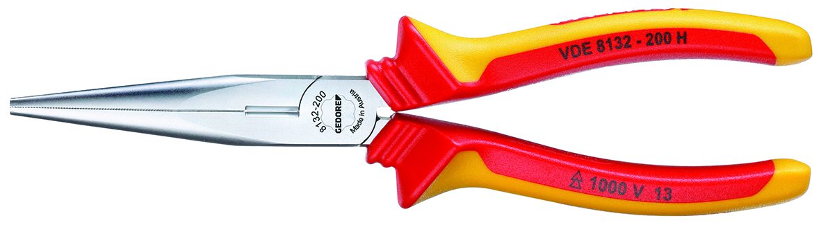This is 200 mm Steel Long Nose Pliers with 75.7mm Jaw Length manufactured by Gedore. The manufacturer part number is VDE 8132-200 H. It jaw is about 75,7mm in length . The product has an integral straight tip. The product is made from highly stable and reliable steel. It has a model number 1552120. Moreover, it has a plier of long nose pliers type . It has an overall length of 200 mm. In addition, Its jaw is 9.5mm in depth . The product consists of 1 pieces.