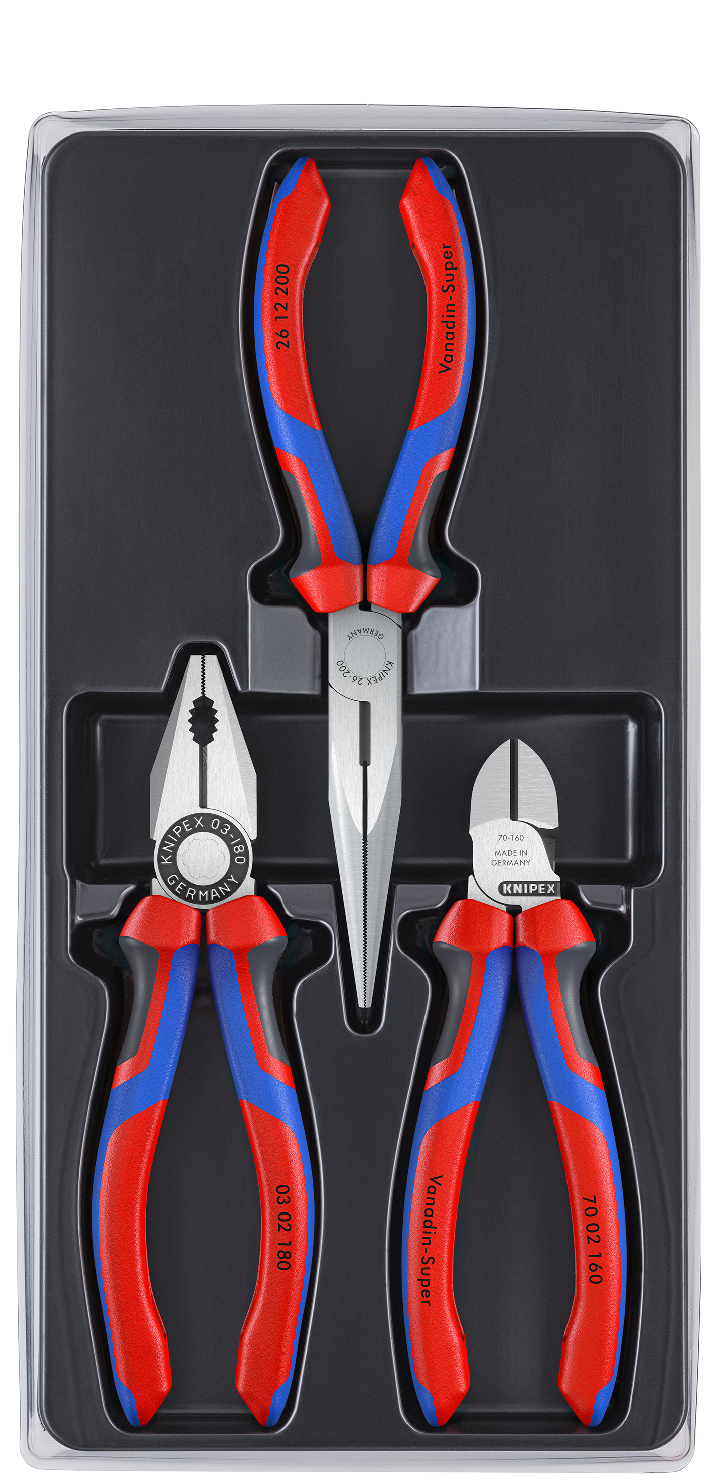 This is 3 pieces Chrome Vanadium Steel Plier Set manufactured by Knipex. The manufacturer part number is 00 20 11. VDE/1000V Approval Options - no. The product has an integral straight tip. It has a non sparking nature no . The product is made from highly stable and reliable chrome vanadium steel. It has an overall length of 185 mm. ESD Safety - no. It is height safe no . The product consists of 3 pieces.