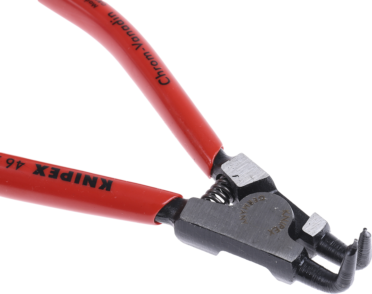 This is 125 mm Chrome Vanadium Steel Circlip Pliers with Bent Tip External Range 3 → 10 mm manufactured by Knipex. The manufacturer part number is 46 21 A01. VDE/1000V Approval Options - no. The product has an integral angled tip. It has a non sparking nature no . It has about 3 → 10 mm size circlip range . The product is made from highly stable and reliable chrome vanadium steel. It has an overall length of 125 mm. Moreover, it has a plier of circlip pliers type . ESD Safety - no. It is height safe no . The product consists of 1 pieces.