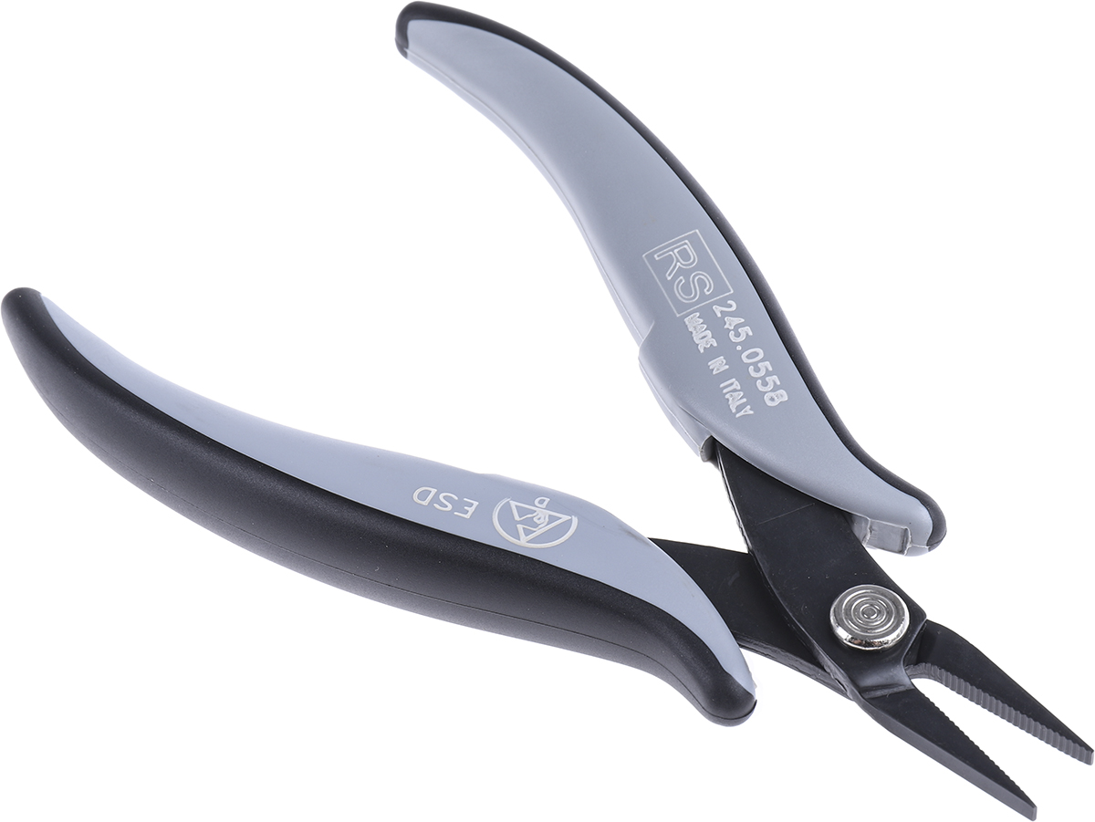 This is ESD 140 mm Steel Flat Nose Pliers with 20mm Jaw manufactured by RS Pro. The manufacturer part number is 245-0558. It jaw is about 20mm in length . The product has an integral straight tip. The product is made from highly stable and reliable steel. Moreover, it has a plier of flat nose pliers type . ESD Safety - yes. It has an overall length of 140 mm.