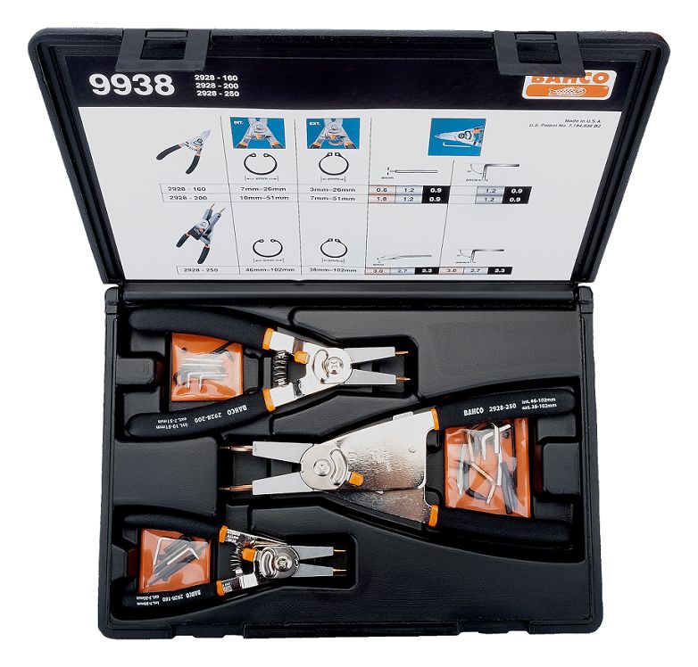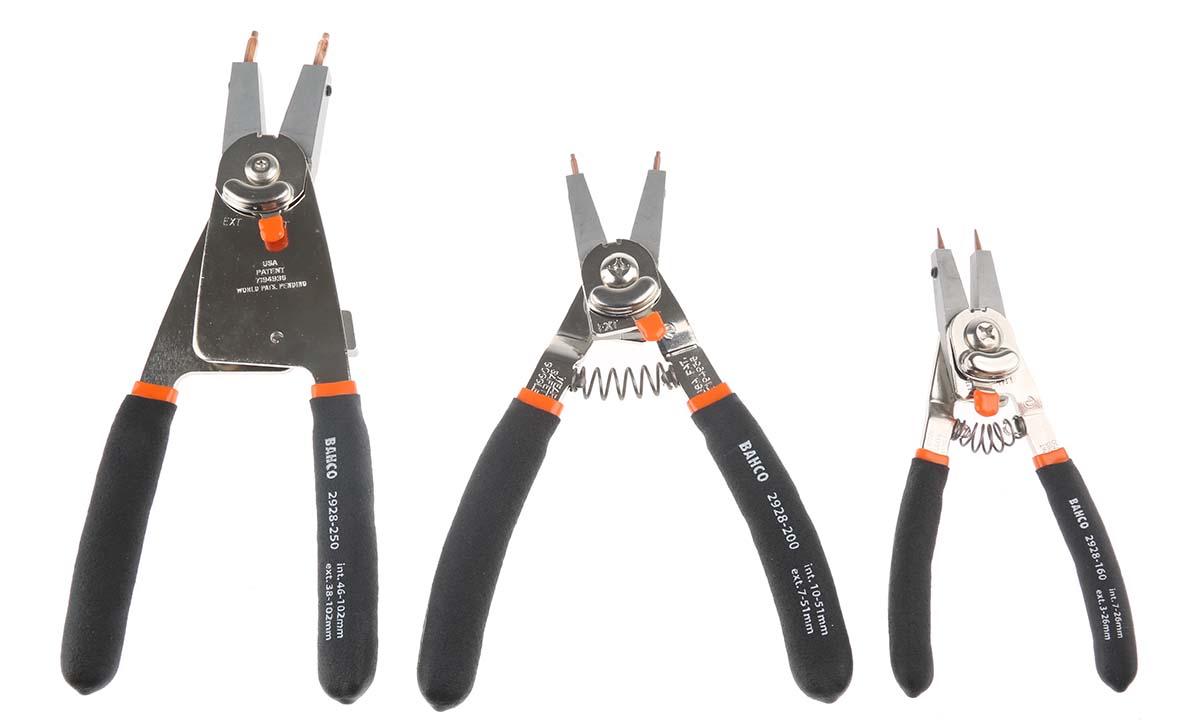 This is 3 pieces Circlip Plier Set manufactured by Bahco. The manufacturer part number is 9938. The product consists of 3 pieces. It has an overall length of 300 mm.