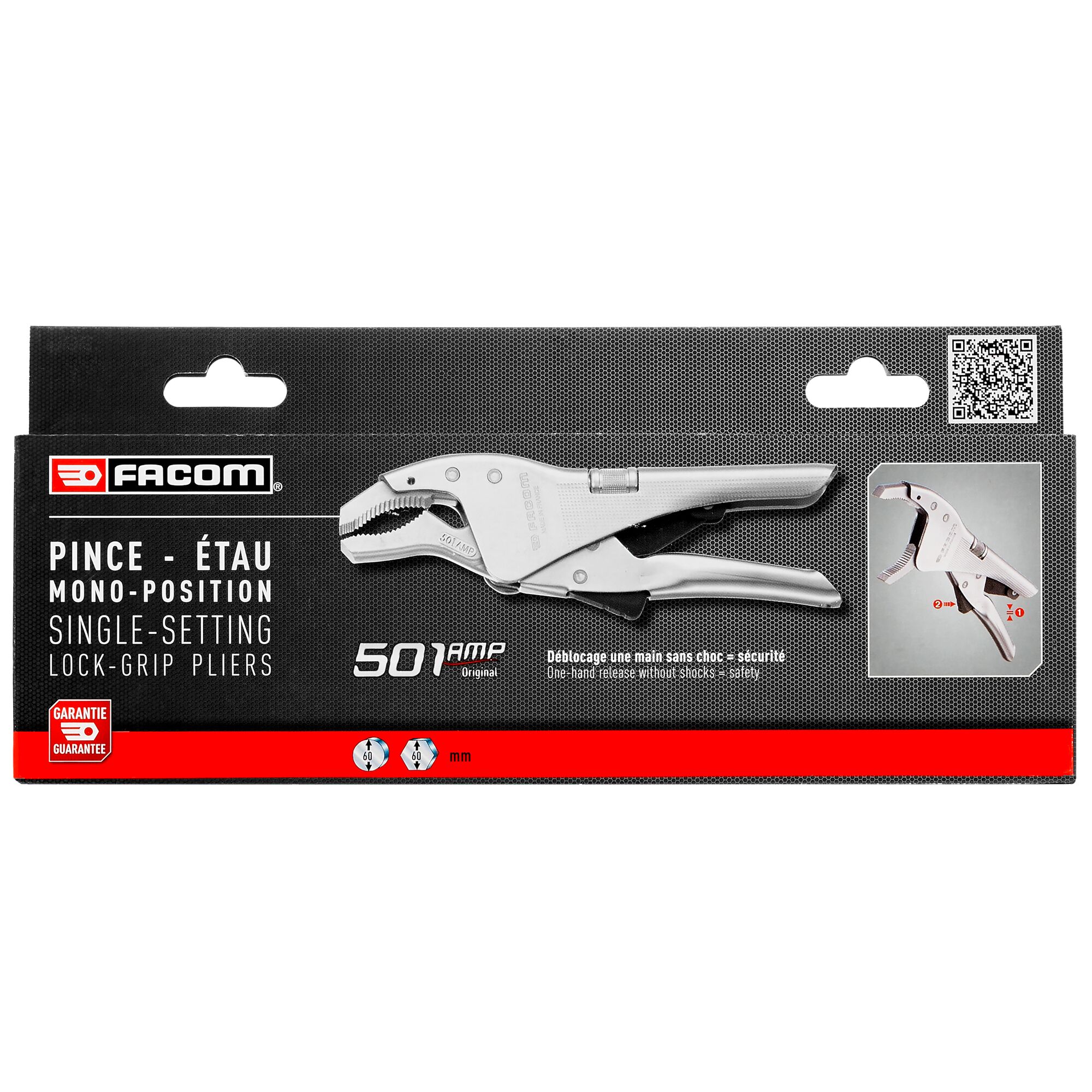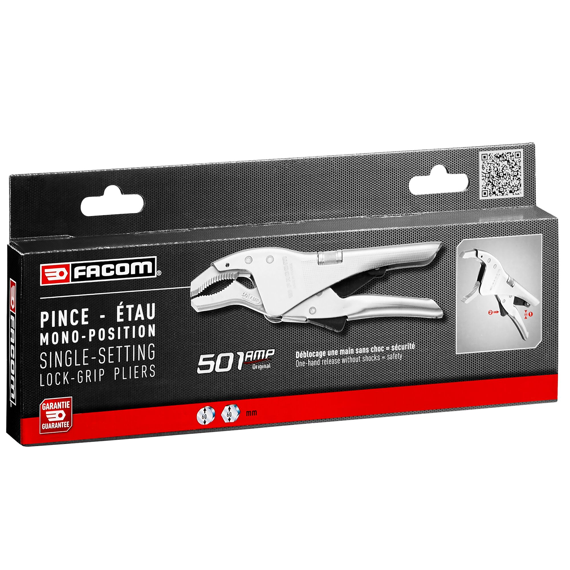 Facom Multi Position Locking Pliers High quality Facom Locking Pliers with a large jaw capacity. Serrated parallel jaws for excellent grip Multi position slip joint system Thumbwheel fine jaw adjustment Jaw locking trigger to avoid accidental opening Knurled grip for frim holding Chrome finish