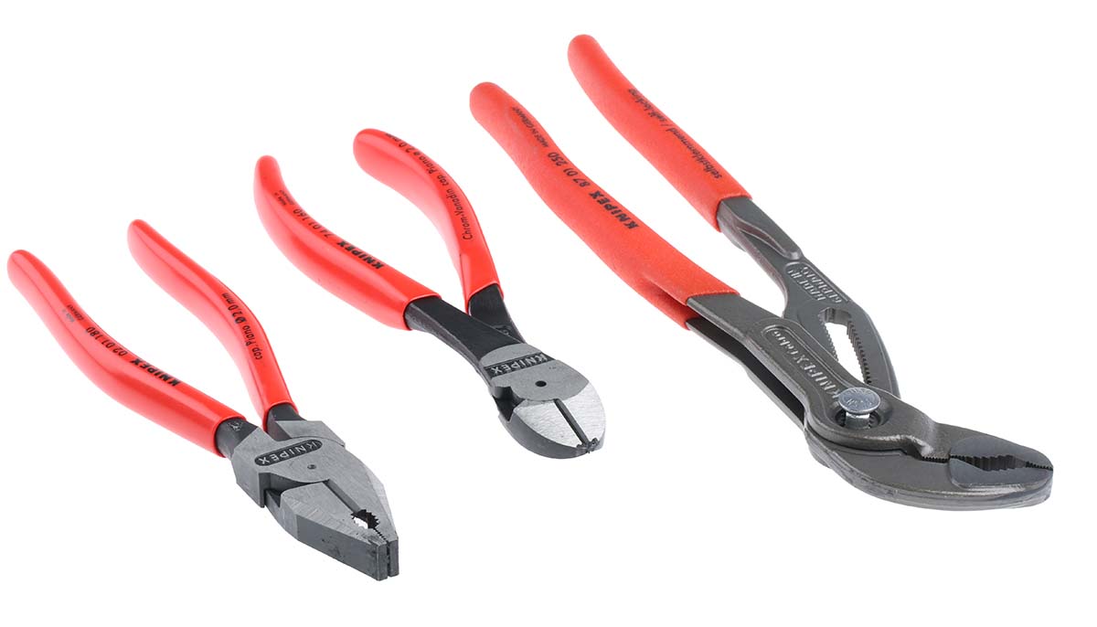 This is 3 pieces Plier Set manufactured by Knipex. The manufacturer part number is 00 20 10. VDE/1000V Approval Options - no. It has a non sparking nature no . The product is made from highly stable and reliable chrome vanadium steel. It has an overall length of 175 mm. ESD Safety - no. It is height safe no . The product consists of 3 pieces.