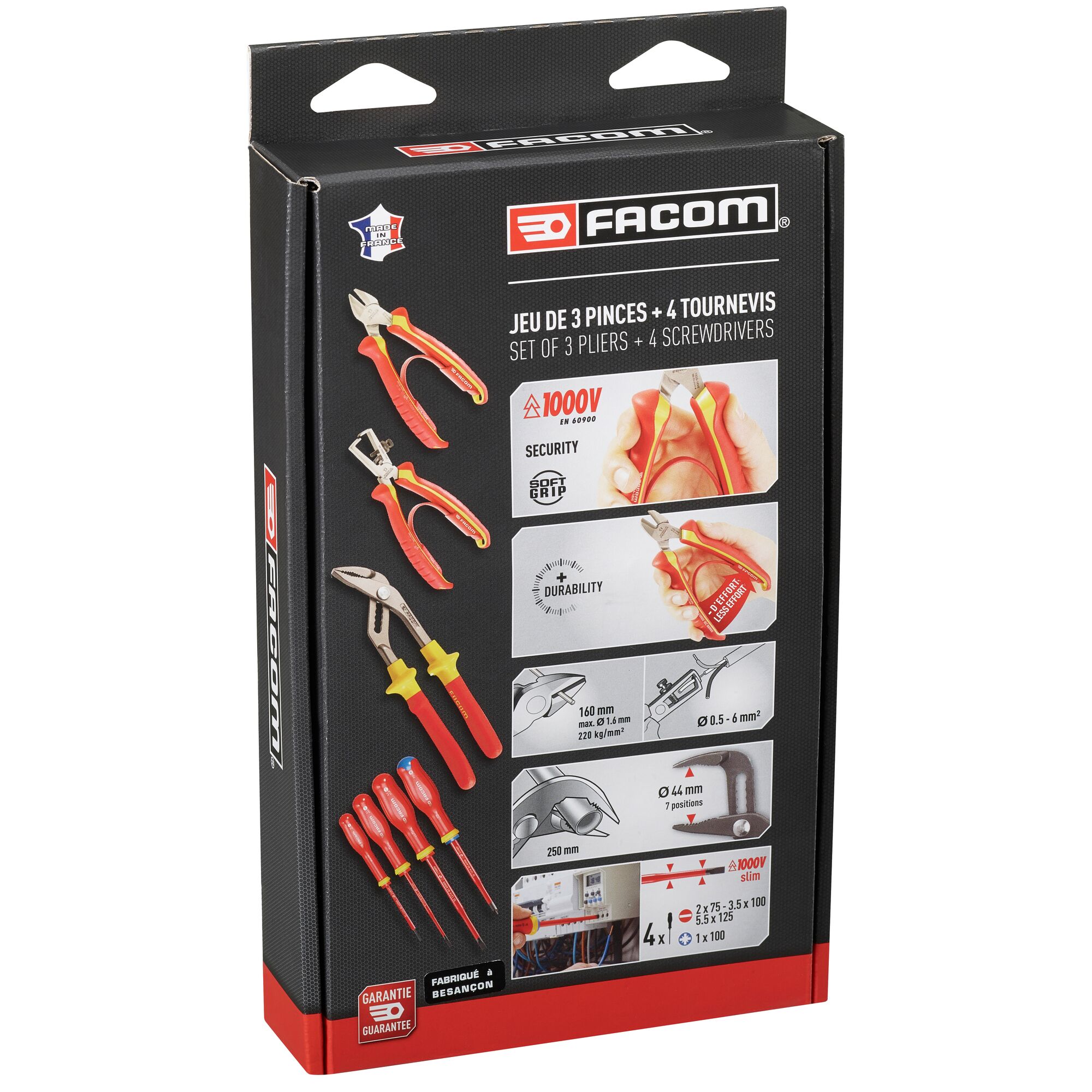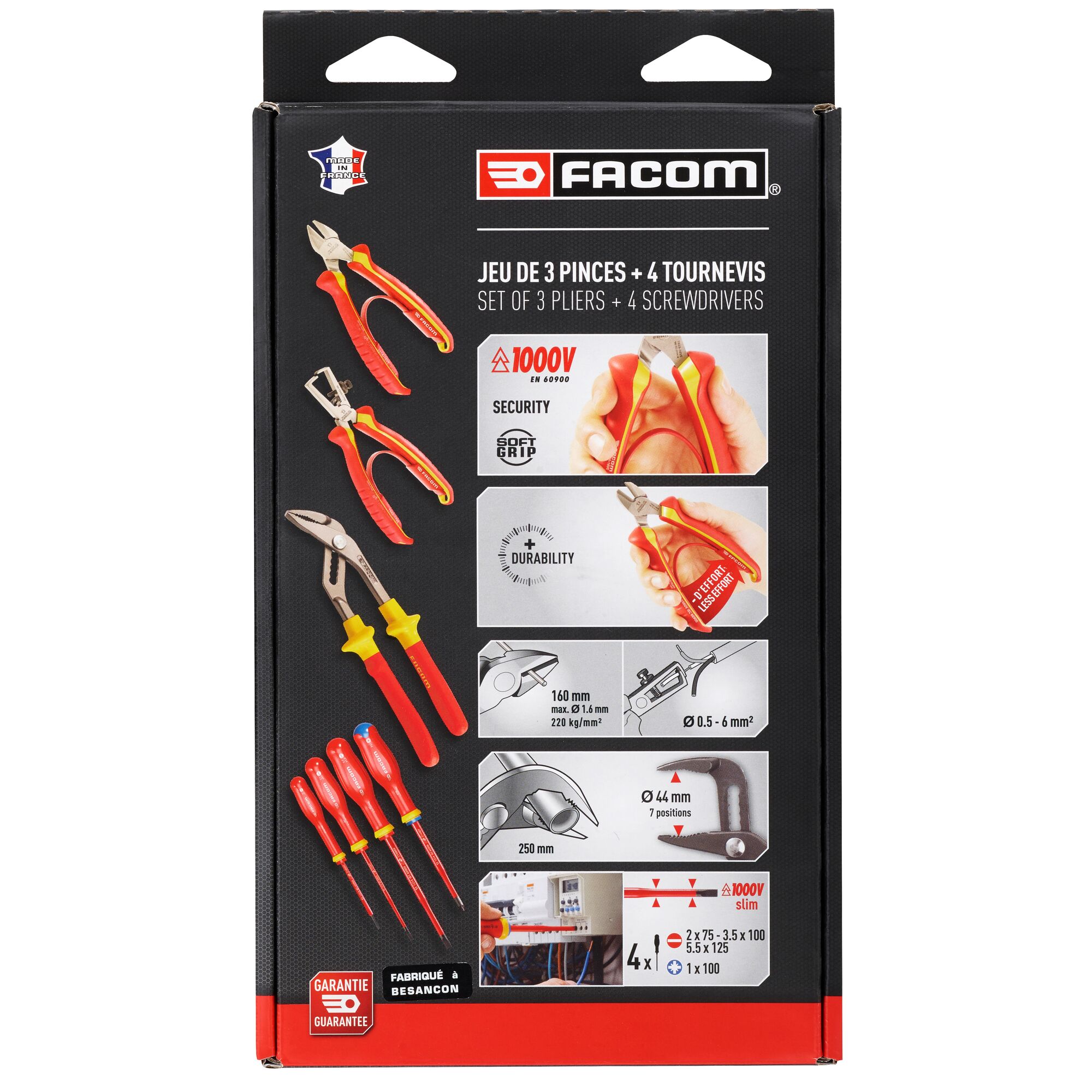 This is 7 Piece VDE/1000 V Electricians Tool Kit manufactured by Facom. The manufacturer part number is VE.A2PB. VDE/1000V Approval Options - no. It has a non sparking nature no . It has a model number ve.a2pb. The product consists of 7 pieces.