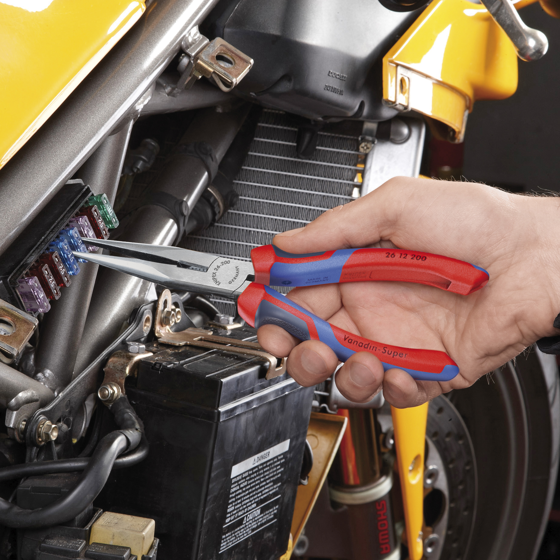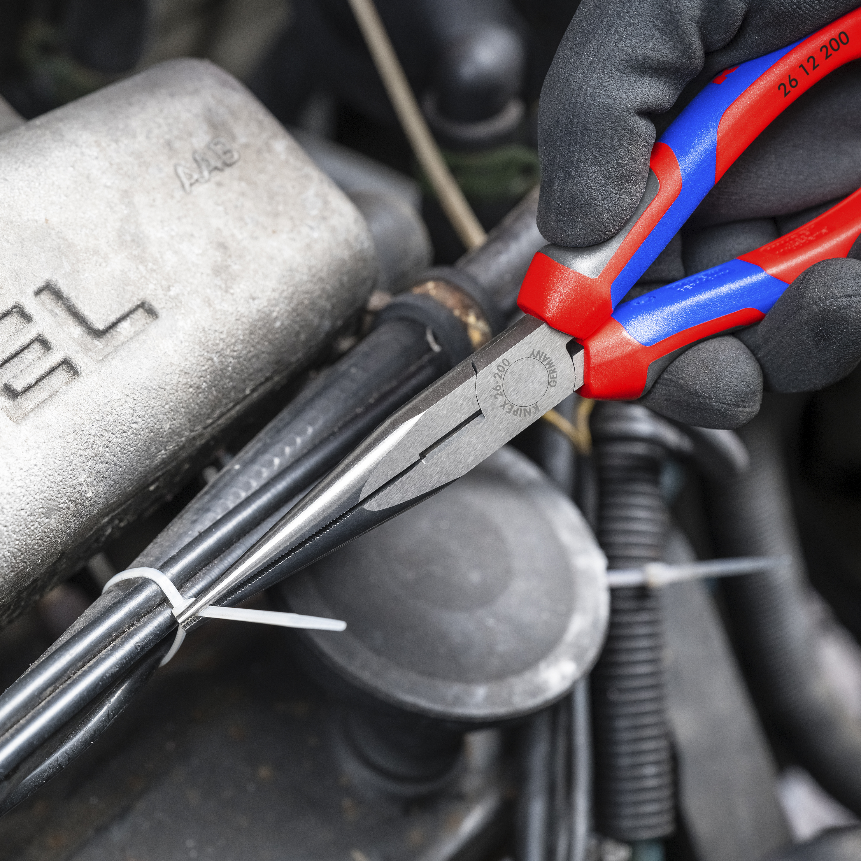 This is Steel Nose pliers 200 mm Overall Length manufactured by Knipex. The manufacturer part number is 26 12 200. It jaw is about 73mm in length . The product has an integral straight tip. It has a non sparking nature no . The product is made from highly stable and reliable vanadium electric steel. It has an overall length of 200 mm. Moreover, it has a plier of long nose pliers type . VDE/1000V Approval Options - no. ESD Safety - no. It has the capability of cutting soft steel wire; medium wire; hard steel wire; steel wire material . It is height safe no . Its typical cutting capacity is hard wire: 2.2 mm, medium hard wire: 3.2 mm . The product consists of 1 pieces.