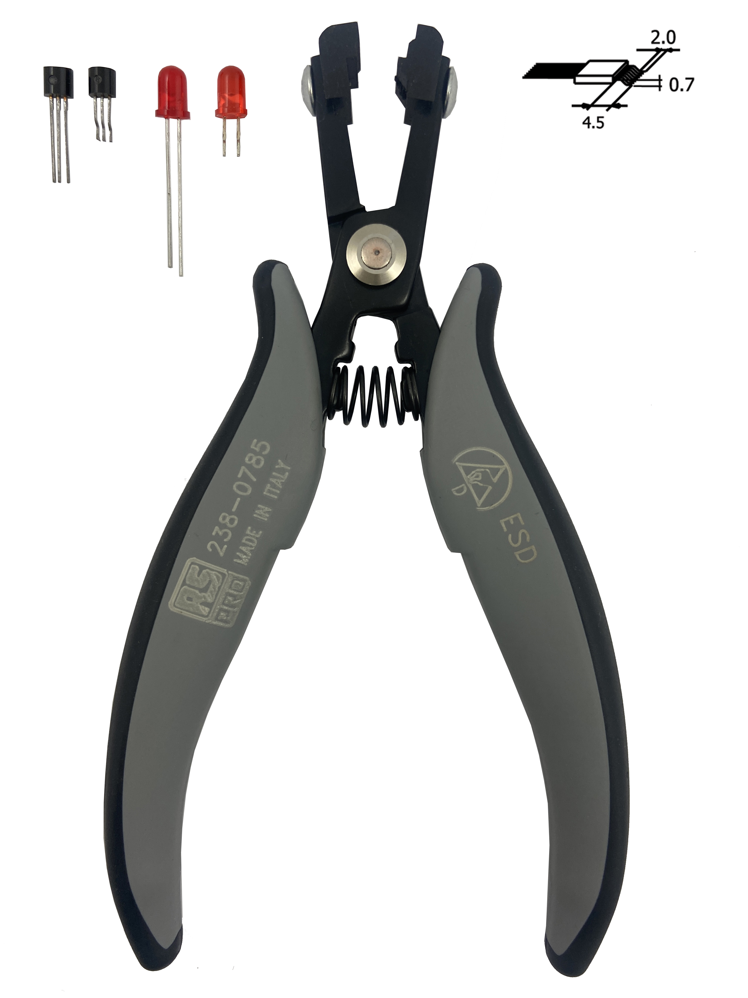 This is ESD Carbon Steel Pliers 150 mm Overall Length manufactured by RS PRO. The manufacturer part number is 238-0785. Its typical cutting capacity is 0.8 mm . The product is made from highly stable and reliable carbon steel. Moreover, it has a plier of forming pliers type . ESD Safety - yes. It has an overall length of 150 mm. The product consists of 1 pieces.