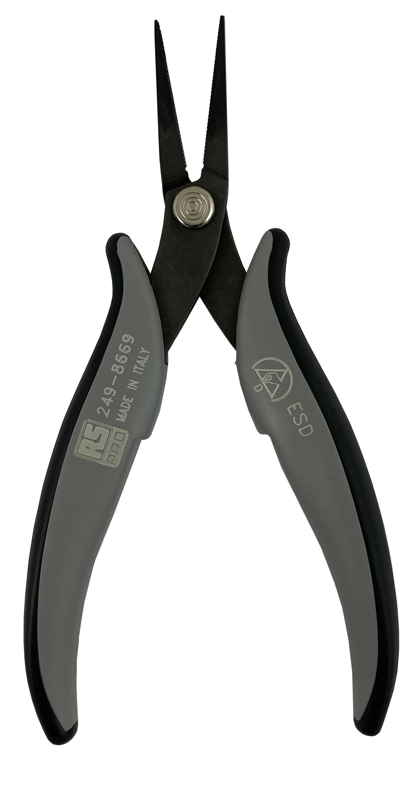 This is ESD Carbon Steel Pliers 160 mm Overall Length manufactured by RS PRO. The manufacturer part number is 249-8669. It jaw is about 28mm in length . The product has an integral straight tip. The product is made from highly stable and reliable carbon steel. It has an overall length of 160 mm. Moreover, it has a plier of long nose pliers type . It has the capability of cutting soft wire material . ESD Safety - yes. The product consists of 1 pieces.
