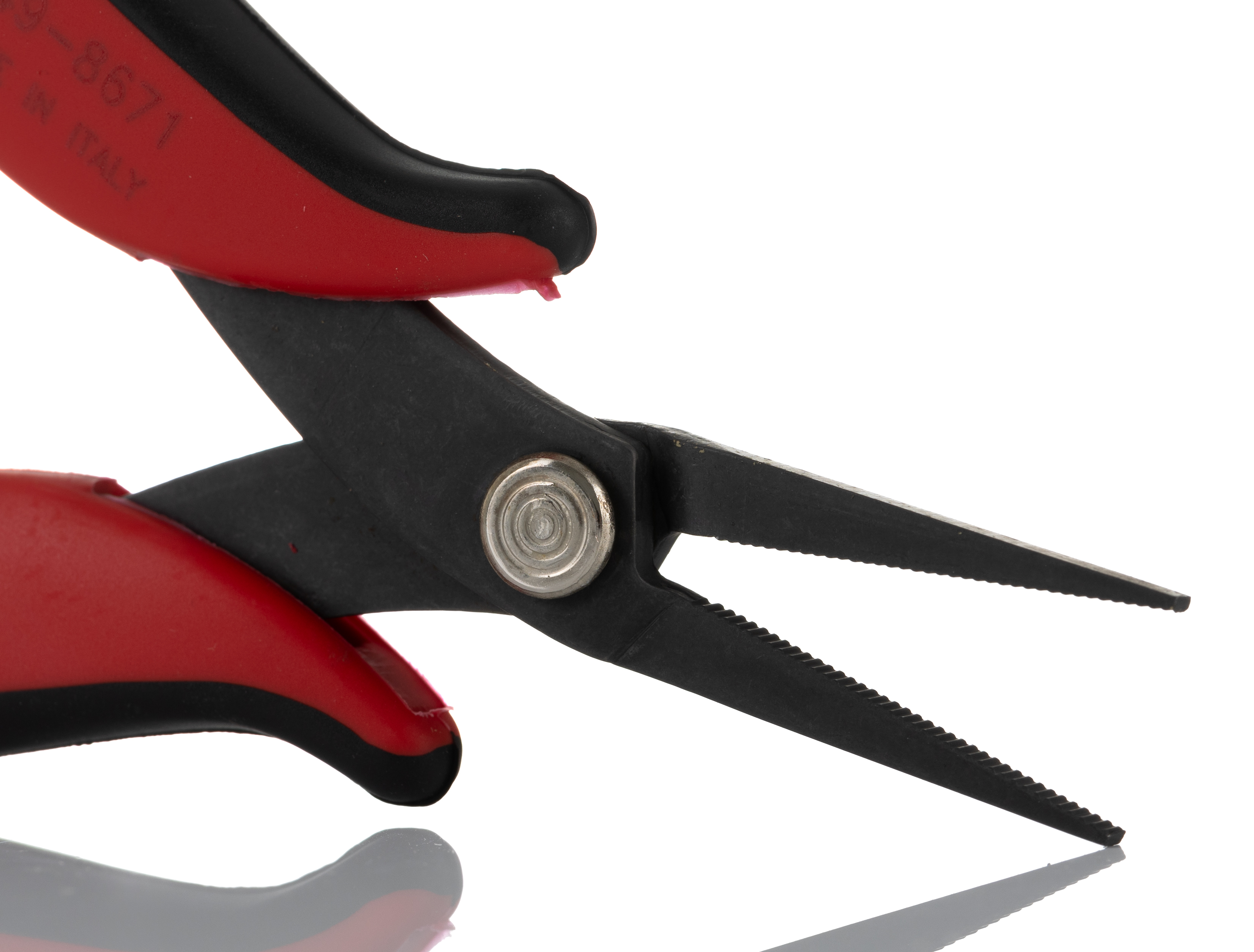 This is Carbon Steel Pliers 160 mm Overall Length manufactured by RS PRO. The manufacturer part number is 249-8671. It jaw is about 28mm in length . The product has an integral straight tip. The product is made from highly stable and reliable carbon steel. It has an overall length of 160 mm. Moreover, it has a plier of flat nose pliers type . It has the capability of cutting soft wire material . ESD Safety - no. The product consists of 1 pieces.