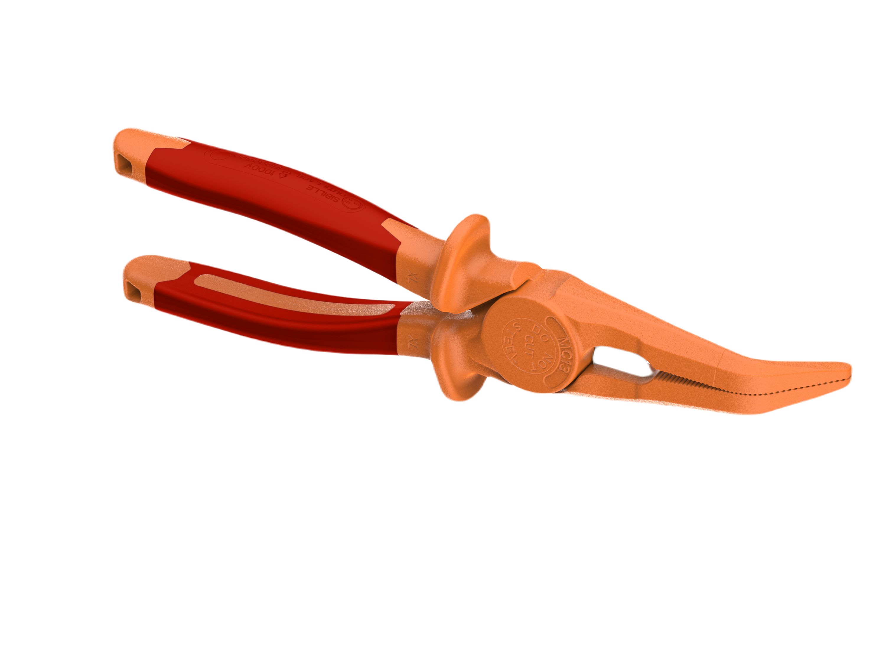 The Penta Insulating long bent nose plier is particularly suitable for low voltage live working in confined spaces where the risk of a short-circuit can have serious consequences for people and installations. Bi material handle allowing a good grip and ease of handling without risk of damage to the gloves Arm profile allowing the transmission of important effort with ease Hanging system ideal for work at height