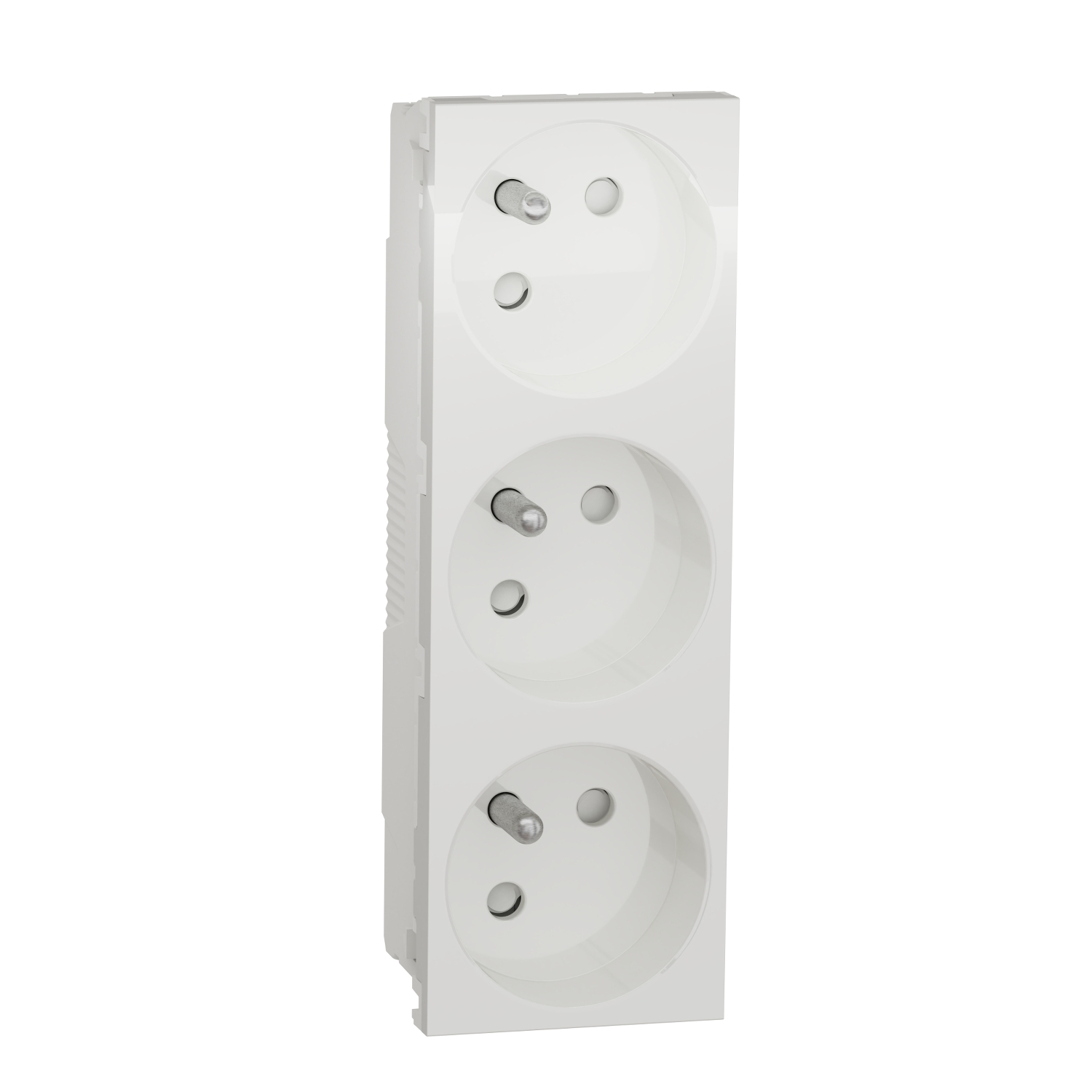 This is White 3 Gang Power Socket 2 Poles 16A French 2P Indoor Use manufactured by Schneider Electric. The manufacturer part number is NU307918T. It is tailored with a/an white colour family . The product has a current rating of 16a. Moreover, it has a minimum 30mm box depth . It has a screwtype faceplate mounting . It is suitable for indoor use . The product is made from highly stable and reliable pc. Similarly, the product has 39.4mm of overall depth. It has a iec standard fixing . Moreover, the product has a nominal 250 v voltage rating. Moreover, it has 135mm of overall height. It features unica range. Better World Verification Options - green premium. Is it a better world product? yes. Furthermore, the product has an overall dimensions of 135 x 45 x 39.4mm. It is typically switched no . It has an overall width of 45mm. It comprises 3 gangs. The terminal is a screwless terminal type. The product is available in flush mount style. It includes an earth terminal yes . It has equipped with 2 poles. The french 2p socket offers profound benefits and is well-designed. It has a decent white colour.