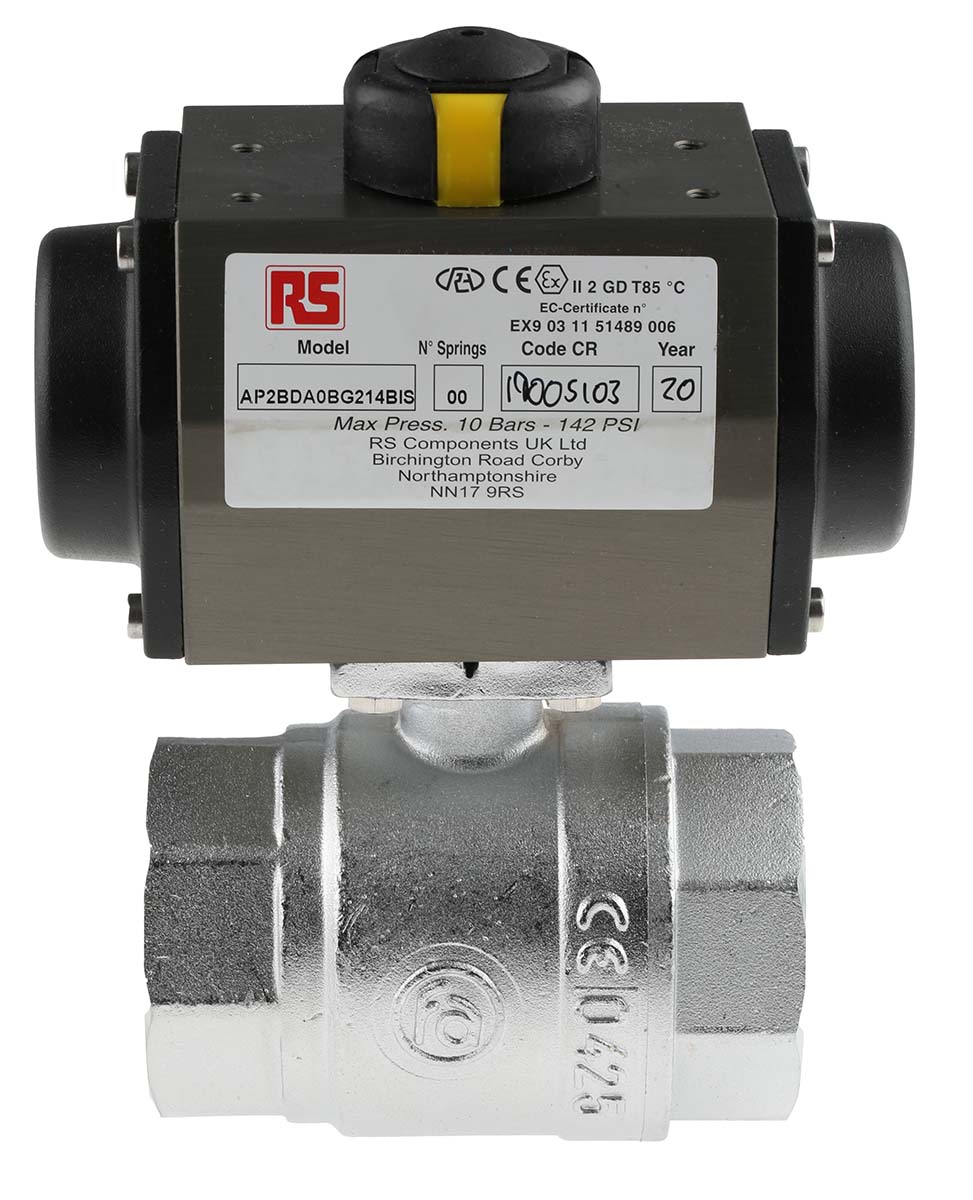 This is Ball Pneumatic Valve 2 in BSP manufactured by RS Pro. The manufacturer part number is 760-5595. The product contains a high-quality ball type valve . It provides up to 40 bar maximum working pressure. It has a typical thread size of 2in. The threaded is a bsp standard. The default valve position is nc . It has a direct action type return .