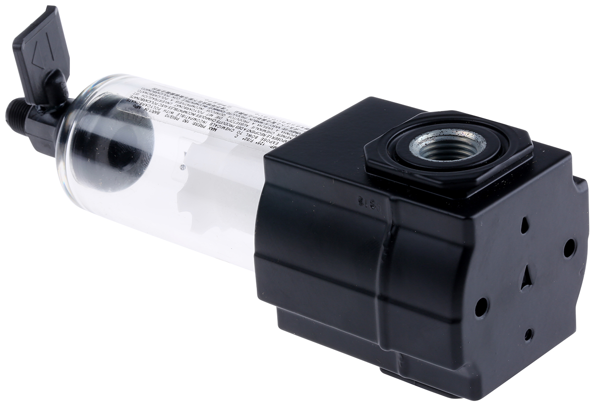 The filter is easy to install and can be mounted in any position. It has a G 1/4 connection and comes with a manual drain valve for easy removal of collected contaminants.