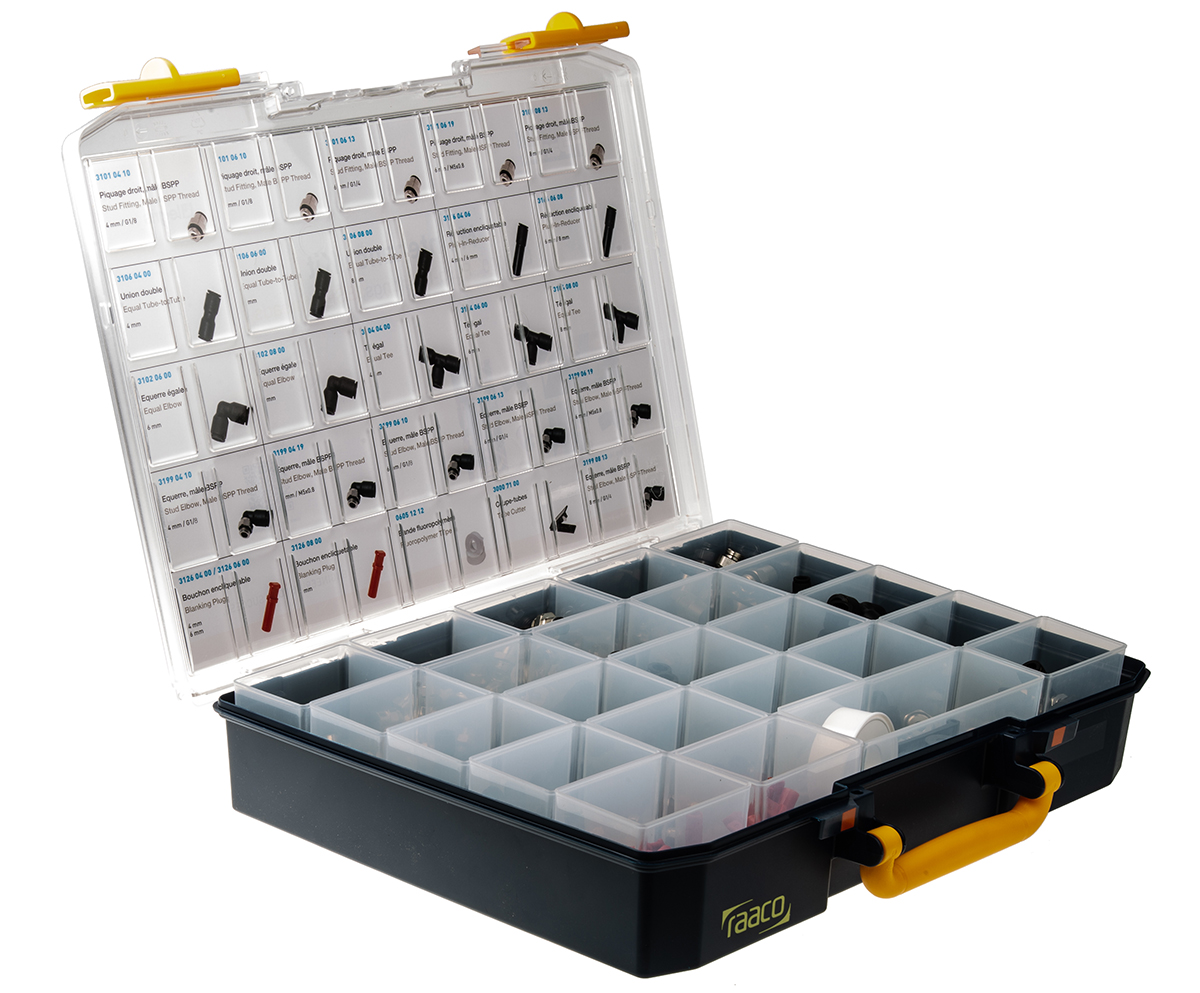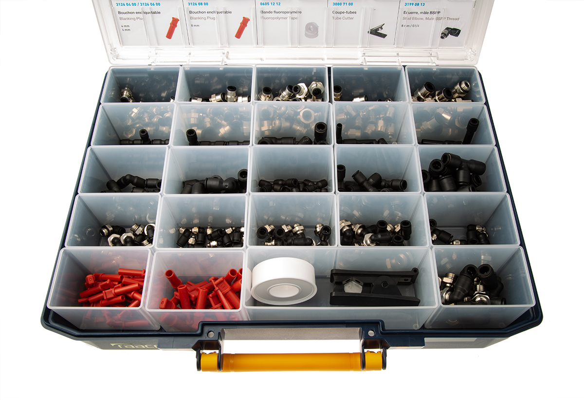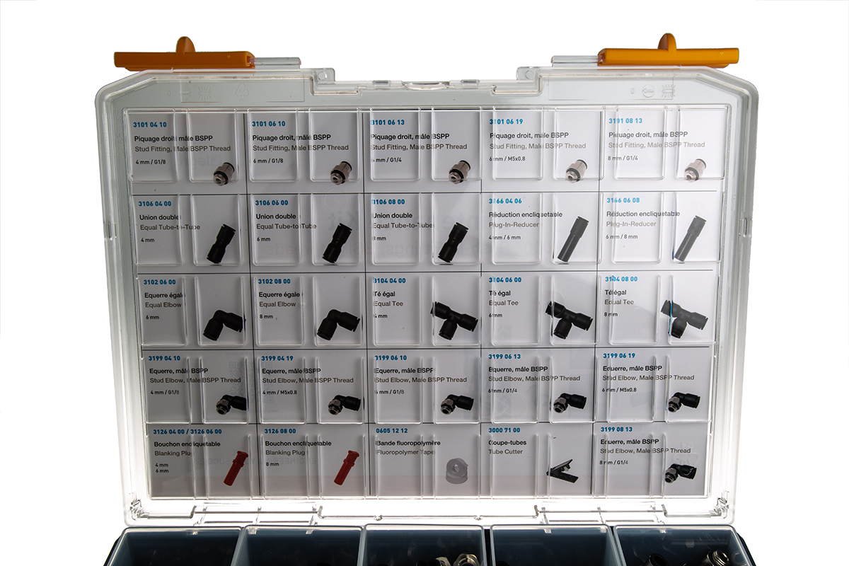 This is Pneumatic Fittings Kit manufactured by Legris. The manufacturer part number is 3150 00 01 57RS. This versatile kit contents include 0605 12 12 fluoropolymer tape, 3000 71 00 tube cutter, 4 mm (dia.) blanking plugs x 20, 4 mm (dia.) equal & unequal tee x 10, 4 mm (dia.) male stud coupling x 10, 4 mm (dia.) male stud elbow x 20, 4 mm (dia.) reducer x 10, 4 mm (dia.) tube to tube connector x 10, 6 mm (dia.) blanking plugs x 20, 6 mm (dia.) equal & unequal elbow x 10, 6 mm (dia.) equal & unequal tee x 10, 6 mm (dia.) male stud coupling x 10, 6 mm (dia.) male stud elbow x 20, 6 mm (dia.) reducer x 10, 6 mm (dia.) tube to tube connector x 10, 8 mm (dia.) blanking plugs x 20, 8 mm (dia.) equal & unequal elbow x 10, 8 mm (dia.) equal & unequal tee x 10, 8 mm (dia.) male stud coupling x 10, 8 mm (dia.) male stud elbow x 20, 8 mm (dia.) tube to tube connector x 10 components.