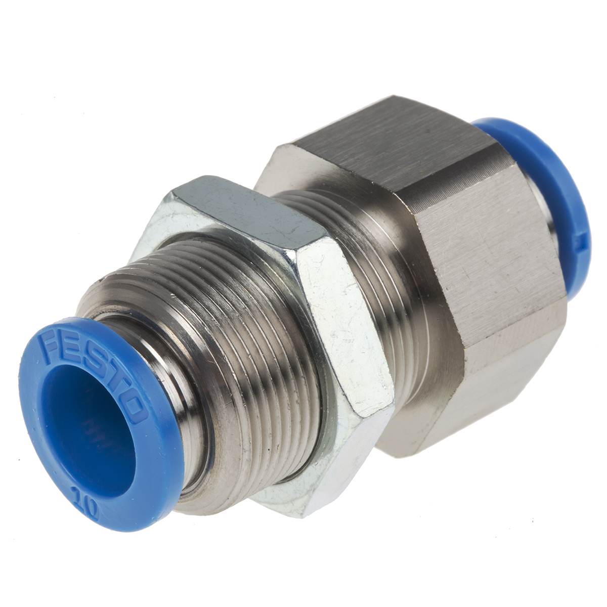 This is Pneumatic Bulkhead Tube-to-Tube Adapter Straight Push In 10 mm to Push In 10 mm manufactured by Festo. The manufacturer part number is QSS-10-F. A quality product with a nice nickel plated finish. Whereas, the minimum operating temperature of the product is -10°c. It features 14 bar maximum operating pressure. While the connector B is push in 10 mm. Moreover, its thread is made up of brass material . The connector A is push in 10 mm connector. While it has 130643 of model number. The product has a tube-to-tube style. The product's body is nicely designed from brass materials. The product has a qss manufacturer series. The pneumatic fitting is a bulkhead tube-to-tube adaptor. It has a maximum operating temperature of +80°c.
