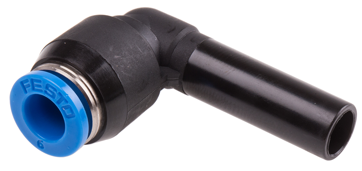 This is Pneumatic Elbow Tube-to-Tube Adapter Push In 8 mm to Push In 6 mm manufactured by Festo. The manufacturer part number is QSL-8H-6. It is designed for food grade no . It has a 90° angle . It features 14 bar maximum operating pressure. The product is available in inline configuration. While the connector B is push in 6 mm. Moreover, its thread is made up of nickel plated brass material . Whereas, the minimum operating temperature of the product is -10°c. The connector A is push in 8 mm connector. While it has 153062 of model number. The product has a tube-to-tube style. The product's body is nicely designed from pbt materials. The product has a qsl manufacturer series. It is resistant to chemical no . The pneumatic fitting is a elbow tube-totube adaptor. It has a maximum operating temperature of +80°c. It includes a swivel connection .
