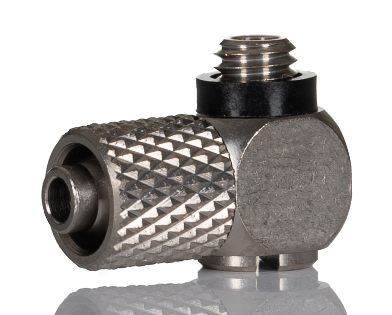 This is Hose Elbow M5 x 0.8 Male Hose 6 mm manufactured by SMC. The manufacturer part number is M-5HL-6. It has a 90° angle . It features 1.5 mpa maximum operating pressure. While the connector B is barbed 6 mm. The connector A is m5 male connector. The threaded connection is m5 male. The product has a threaded-to-tube style. The product's body is nicely designed from nickel plated brass materials. The product has a m manufacturer series. The pneumatic fitting is a elbow threaded adaptor. It includes a swivel connection .