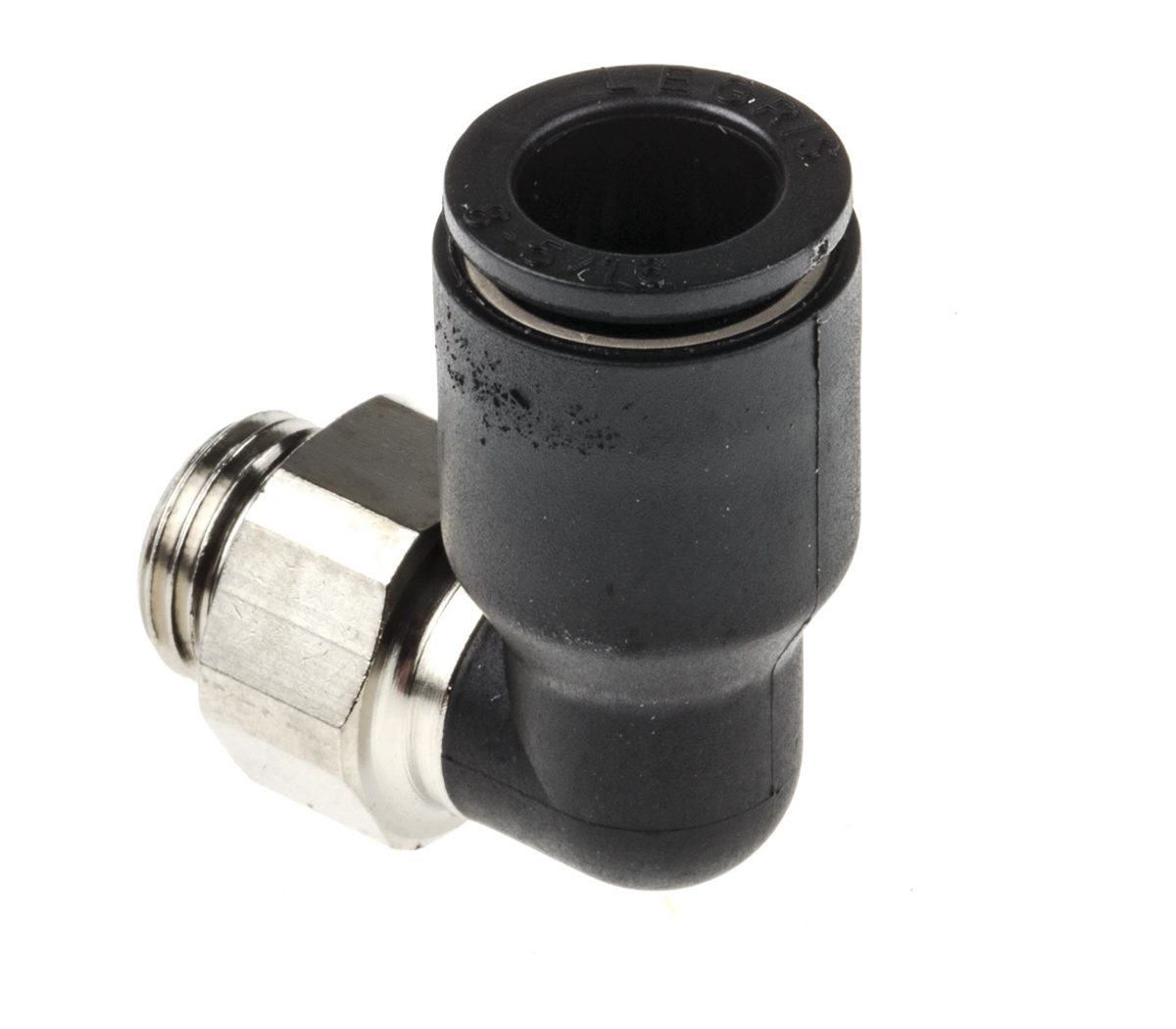 The adapter connects an 8mm pneumatic tube to a G 1/8 threaded port at a 90-degree angle. The push-in mechanism allows for a tool-free tube insertion, locking it securely, while the threaded end screws into a port, forming a leak-proof seal.