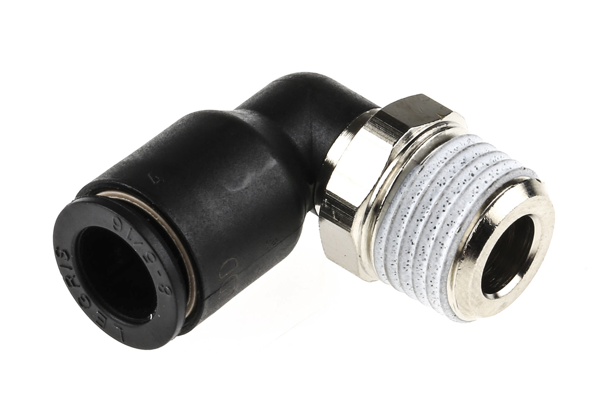 This is Pneumatic Elbow Threaded-to-Tube Adapter R 1/4 Male Push In 8 mm manufactured by Legris. The manufacturer part number is 3109 08 13. It has a 90° angle . It features 20 bar maximum operating pressure. The product is available in inline configuration. While the connector B is push in 8 mm. The connector A is r 1/4 male connector. Moreover, its thread is made up of nickel plated brass material . The threaded connection is r 1/4 male. The product has a threaded-to-tube style. The product's body is nicely designed from glass reinforced nylon materials. The product has a lf3000 manufacturer series. Whereas, the minimum operating temperature of the product is -20°c. The pneumatic fitting is a elbow threaded adaptor. It has a maximum operating temperature of +80°c. It includes a swivel connection .