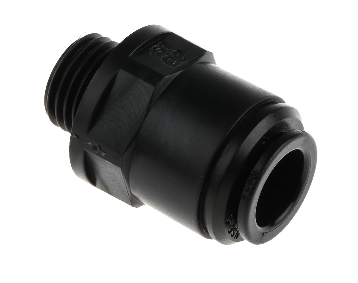 This is Pneumatic Straight Threaded-to-Tube Adapter G 1/4 Male Push In 10 mm manufactured by John Guest. The manufacturer part number is PM011012E. It features 10 bar maximum operating pressure. The product is available in inline configuration. While the connector B is push in 10 mm. The connector A is g 1/4 male connector. Moreover, its thread is made up of acetal copolymer material . The threaded connection is g 1/4 male. The product has a threaded-to-tube style. The product's body is nicely designed from acetal copolymer materials. The product has a pm manufacturer series. Whereas, the minimum operating temperature of the product is -20°c. The pneumatic fitting is a straight threaded adaptor. It has a maximum operating temperature of +65°c.