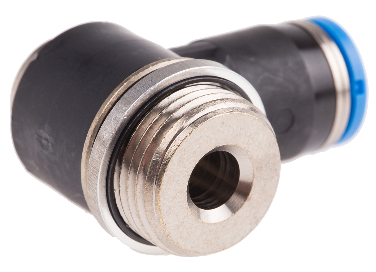 This is Pneumatic Elbow Threaded-to-Tube Adapter G 3/8 Male Push In 8 mm 8mm Tube Connection manufactured by Festo. The manufacturer part number is QSLV-G3/8-8-I. The connector A is g 3/8 male connector. It has a 90° angle . It features 14 bar maximum operating pressure. The product is available in inline configuration. While the connector B is push in 8 mm. Moreover, its thread is made up of nickel plated brass material . It is designed for food grade no . While it has 186152 of model number. The threaded connection is g 3/8 male. The product has a threaded-to-tube style. The product's body is nicely designed from pbt materials. The product has a qs manufacturer series. Whereas, the minimum operating temperature of the product is -10°c. It is resistant to chemical no . The pneumatic fitting is a elbow threaded adaptor. It has a maximum operating temperature of +80°c. It includes a swivel connection .