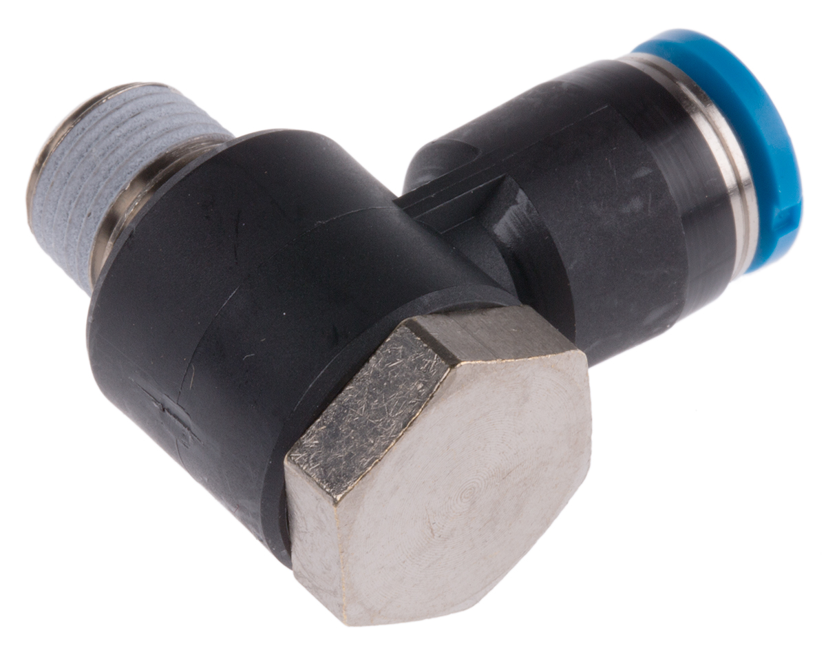 This is Pneumatic Elbow Threaded-to-Tube Adapter R 1/8 Male Push In 6 mm 6mm Tube Connection manufactured by Festo. The manufacturer part number is QSLV-1/8-6. It is designed for food grade no . It has a 90° angle . It features 14 bar maximum operating pressure. The product is available in inline configuration. While the connector B is push in 6 mm. Moreover, its thread is made up of nickel plated brass material . Whereas, the minimum operating temperature of the product is -10°c. The connector A is r 1/8 male connector. While it has 153087 of model number. The threaded connection is r 1/8 male. The product has a threaded-to-tube style. The product's body is nicely designed from pbt materials. The product has a qs manufacturer series. It is resistant to chemical no . The pneumatic fitting is a elbow threaded adaptor. It has a maximum operating temperature of +80°c. It includes a swivel connection .
