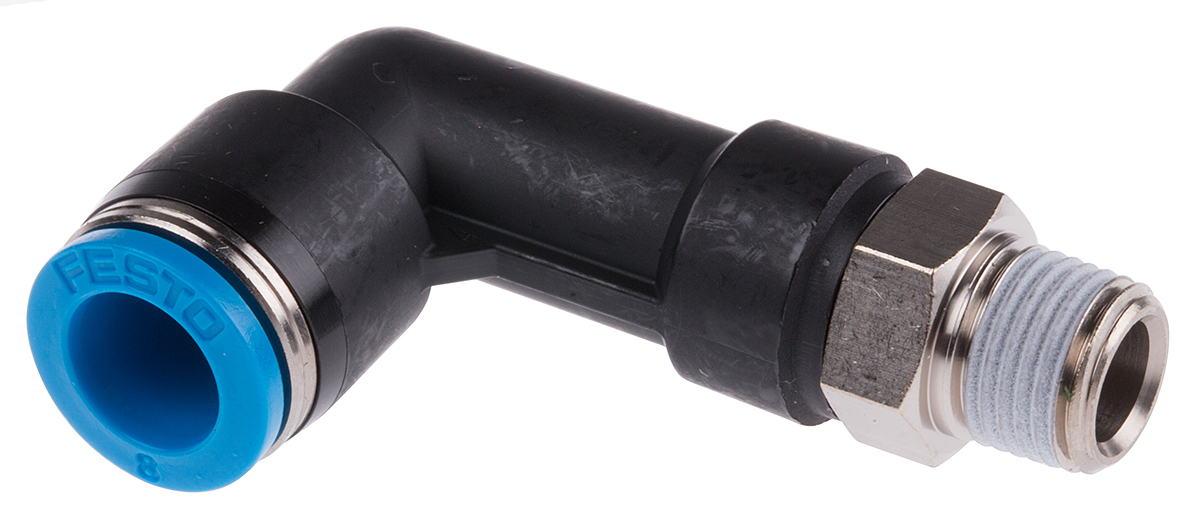 This is Pneumatic Elbow Threaded-to-Tube Adapter R 1/8 Male Push In 8 mm 8mm Tube Connection manufactured by Festo. The manufacturer part number is QSLL-1/8-8. It is designed for food grade no . It has a 90° angle . It features 14 bar maximum operating pressure. The product is available in inline configuration. While the connector B is push in 8 mm. Moreover, its thread is made up of nickel plated brass material . Whereas, the minimum operating temperature of the product is -10°c. The connector A is r 1/8 male connector. While it has 153079 of model number. The threaded connection is r 1/8 male. The product has a threaded-to-tube style. The product's body is nicely designed from pbt materials. The product has a qs manufacturer series. It is resistant to chemical no . The pneumatic fitting is a elbow threaded adaptor. It has a maximum operating temperature of +80°c. It includes a swivel connection .
