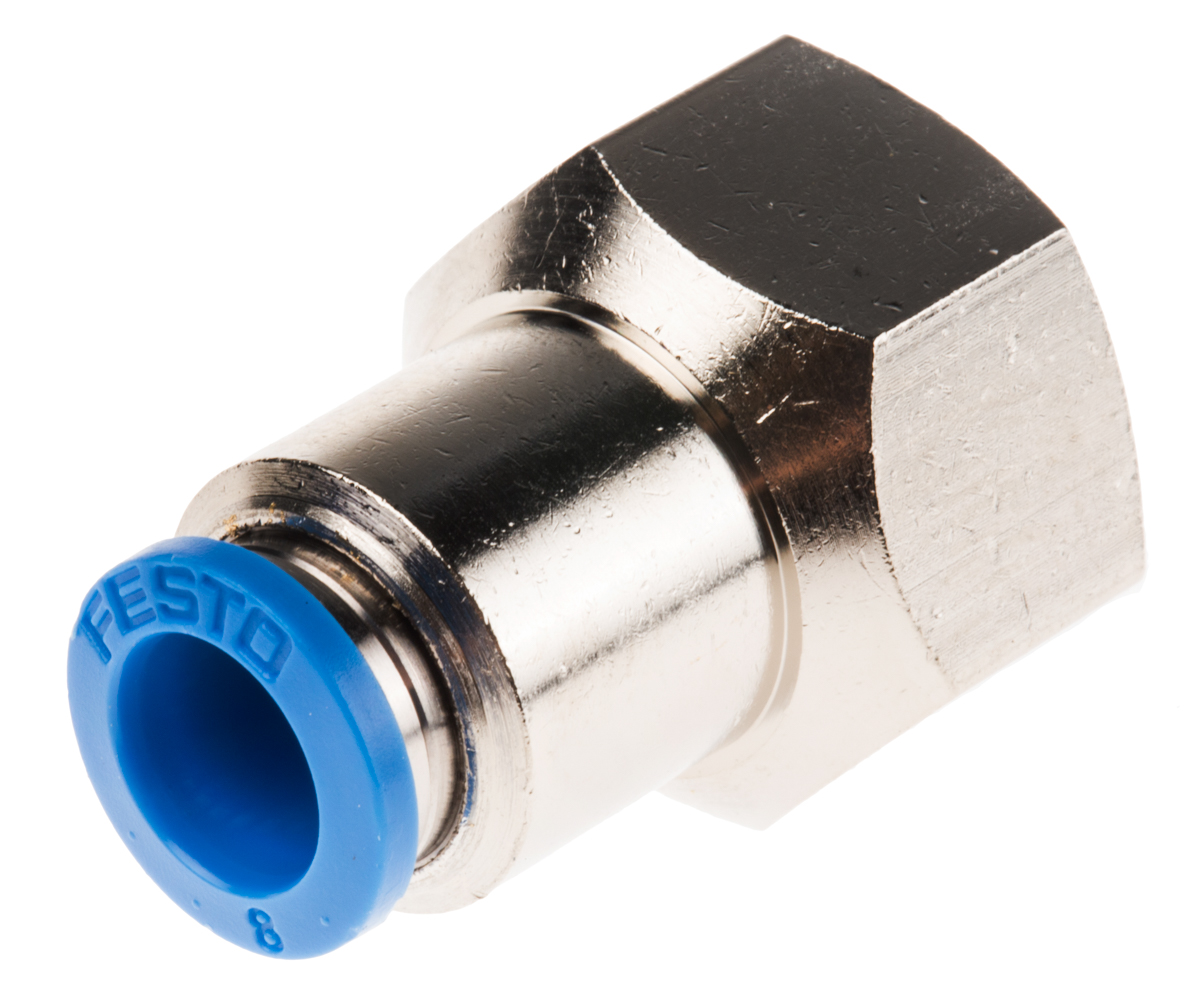 This is Pneumatic Straight Threaded-to-Tube Adapter G 3/8 Female Push In 8 mm Push In 8 mm manufactured by Festo. The manufacturer part number is QSF-3/8-8-B. A quality product with a nice nickel plated finish. The connector A is g 3/8 female connector. It features 14 bar maximum operating pressure. The product is available in inline configuration. While the connector B is push in 8 mm. Moreover, its thread is made up of brass material . It is designed for food grade no . While it has 153027 of model number. The threaded connection is g 3/8 female. The product has a threaded-to-tube style. The product's body is nicely designed from brass materials. The product has a qs manufacturer series. It is resistant to chemical no . The pneumatic fitting is a straight threaded adaptor. It has a maximum operating temperature of +80°c. Whereas, the minimum operating temperature of the product is -10°c.
