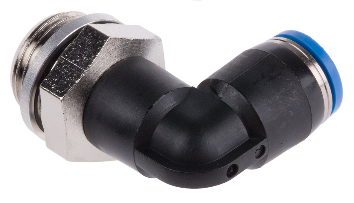 This is Pneumatic Elbow Threaded-to-Tube Adapter G 3/8 Male Push In 8 mm 8mm Tube Connection manufactured by Festo. The manufacturer part number is QSL-G3/8-8. It is designed for food grade no . It has a 90° angle . It features 14 bar maximum operating pressure. The product is available in inline configuration. While the connector B is push in 8 mm. Moreover, its thread is made up of nickel plated brass material . Whereas, the minimum operating temperature of the product is -10°c. The connector A is g 3/8 male connector. While it has 186121 of model number. The threaded connection is g 3/8 male. The product has a threaded-to-tube style. The product's body is nicely designed from pbt materials. The product has a qs manufacturer series. It is resistant to chemical no . The pneumatic fitting is a elbow threaded adaptor. It has a maximum operating temperature of +80°c. It includes a swivel connection .