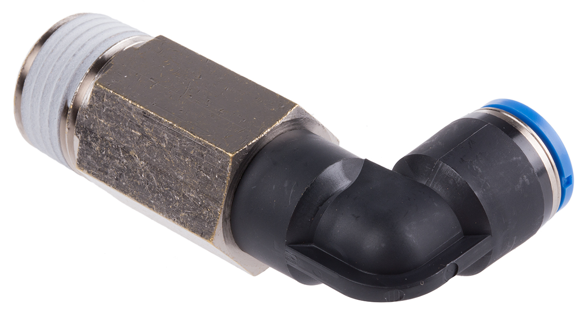 This is Pneumatic Elbow Threaded-to-Tube Adapter R 1/2 Male Push In 10 mm 10mm Tube Connection manufactured by Festo. The manufacturer part number is QSLL-1/2-10. It is designed for food grade no . It has a 90° angle . It features 14 bar maximum operating pressure. The product is available in inline configuration. While the connector B is push in 10 mm. Moreover, its thread is made up of nickel plated brass material . Whereas, the minimum operating temperature of the product is -10°c. The connector A is r 1/2 male connector. While it has 190664 of model number. The threaded connection is r 1/2 male. The product has a threaded-to-tube style. The product's body is nicely designed from pbt materials. The product has a qs manufacturer series. It is resistant to chemical no . The pneumatic fitting is a elbow threaded adaptor. It has a maximum operating temperature of +80°c. It includes a swivel connection .